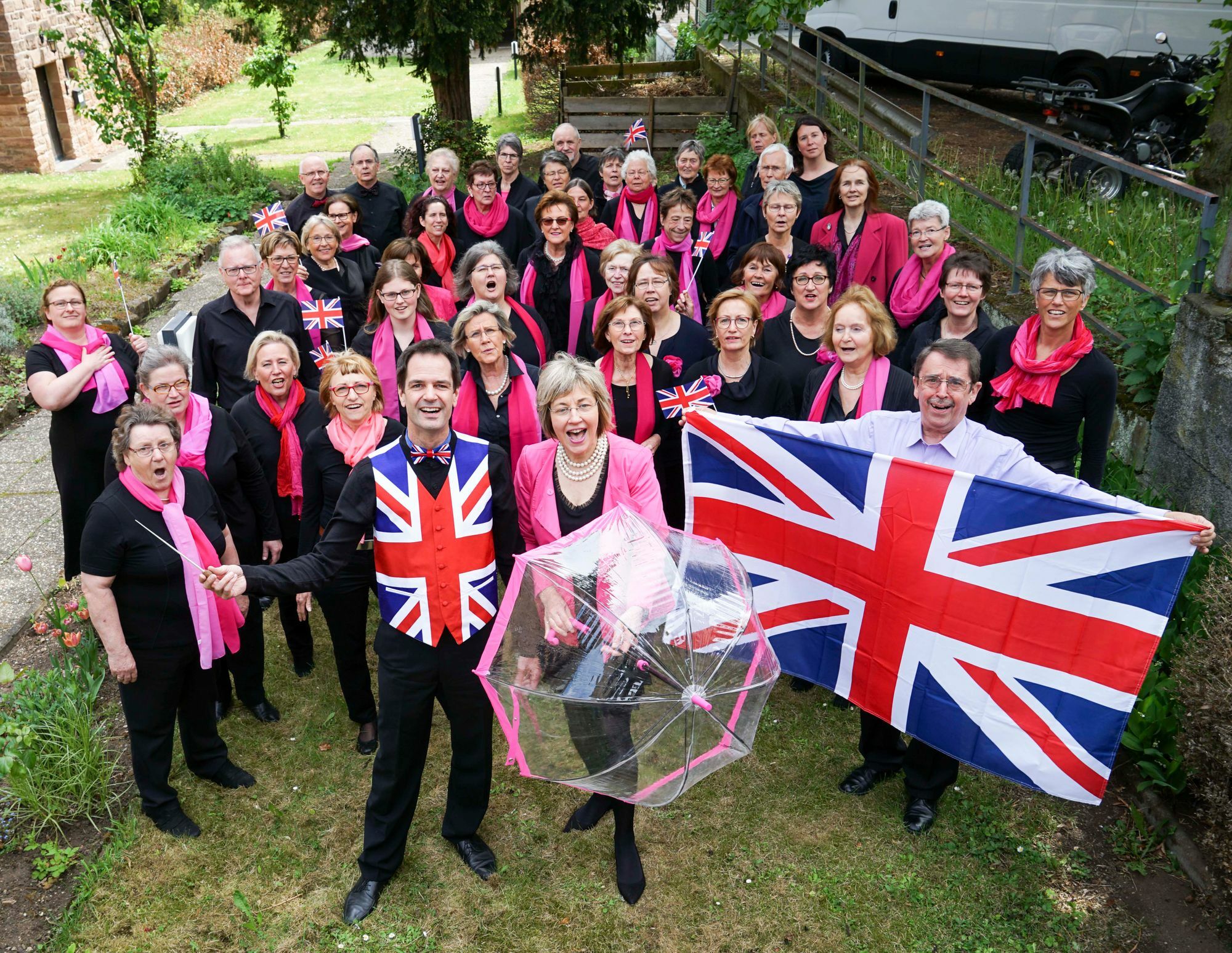 Das Sinfonieorchester Rhein-Main unter der Leitung von Christian Ferel und die beiden Chöre Capriccio und Collegium Vocale bringen die Höhepunkte des Londoner Programms - unter dem Titel „Very British“ - auf die Bühne im Kursaal. Auf dem Programm stehen unter anderem Edward Elgars „Pomp and Circumstance, March No.1 Land of Hope and Glory“ sowie die British Sea Songs „Rule, Britannia“ und „Jerusalem“. Eröffnet wird der stimmungsvolle Abend mit Händels Feuerwerksmusik. „Bei diesen Stücken bleibt es gar nicht aus, dass schon die Probenarbeit viel Freude macht. Wir sind sicher, dass der Funke der Begeisterung auf das Publikum überspringt“, betont Chorleiterin Birgit Ensminger-Busse. Karten für das Konzert am Freitag, den 26. Mai, 19.30 Uhr, sind zum Preis von 15 Euro bzw. ermäßigt 10 Euro unter anderem bei der Tourist-Information Bad Kreuznach, Tel. 0671-8360050, erhältlich. Foto: Proben mit dem Lieblingsschirm von „Her Majesty The Queen“ und dem Union Jack: Die Chöre Capriccio/Collegium Vocale mit Chorleiterin Birgit Ensminger-Busse und Christian Ferel, Leiter des Sinfonieorchesters Rhein-Main (Mitte).