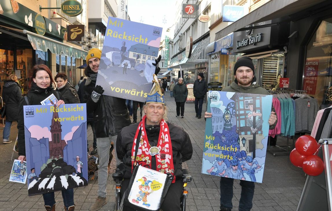 Rund 250 Flyer wurden bei der 90minütigen Werbetour bei strahlendem Sonnenschein und knackiger Kälte verteilt. Sehr gut kam an, dass nicht nur eine Gruppe angesprochen wurde, sondern die Botschaft sich an alle, Autofahrer, Radfahrer und Fußgänger richtete. Mittlerweile hängen die Plakate gut verteilt in der Innenstadt, in Schaufenstern oder an Laternen. Bei Austeilen der Plakate und beim Tragen der Plakate wurden Hansjörg und Marius Rehbein von Juliane Rohrbacher, Eric Barz und Mathias Zimmermann vom Verein Alternative Jugendkultur (AJK) unterstützt. Auch Hündchen Nappo lief tapfer mit und trotzte im wärmenden Wollumhang der Kälte. „Demnächst gibt es auch Auto-Aufkleber“, wünscht sie Oberbürgermeisterin Dr. Heike Kaster-Meurer einen nachhaltigen Effekt der Aktion.