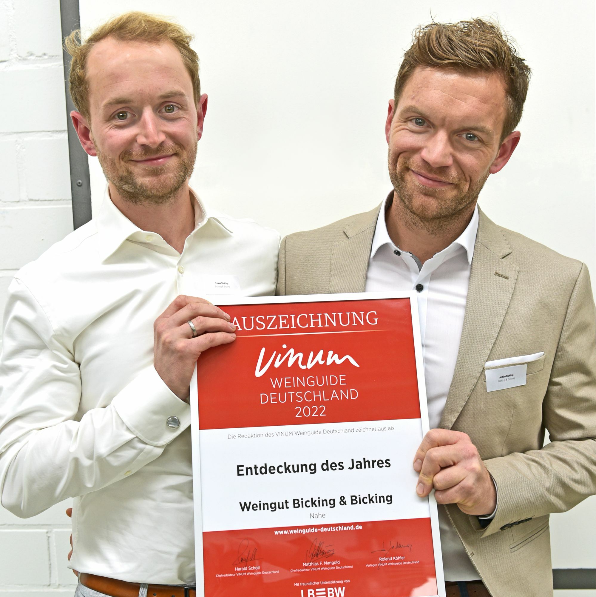 Wer vor einigen Tagen die Präsentation der Preisträger des neuen »Vinum Weinguide Deutschland 2022« im Mainzer Auktionshaus verfolgte, musste eine Zeitlang fürchten, die Weinbauregion Nahe könnte in diesem Jahr leer ausgehen. Doch dann gab es doch noch eine Auszeichnung, und zwar in der Kategorie »Entdeckung des Jahres«: Freuen durften sich über diesen respektablen bundesweiten Titel Lukas (28) und Achim (35) Bicking, deren Weingut in Wallhausen an der Nahe beheimatet ist. Im Internet ist es unter der Adresse www.bicking-bicking.de zu finden.