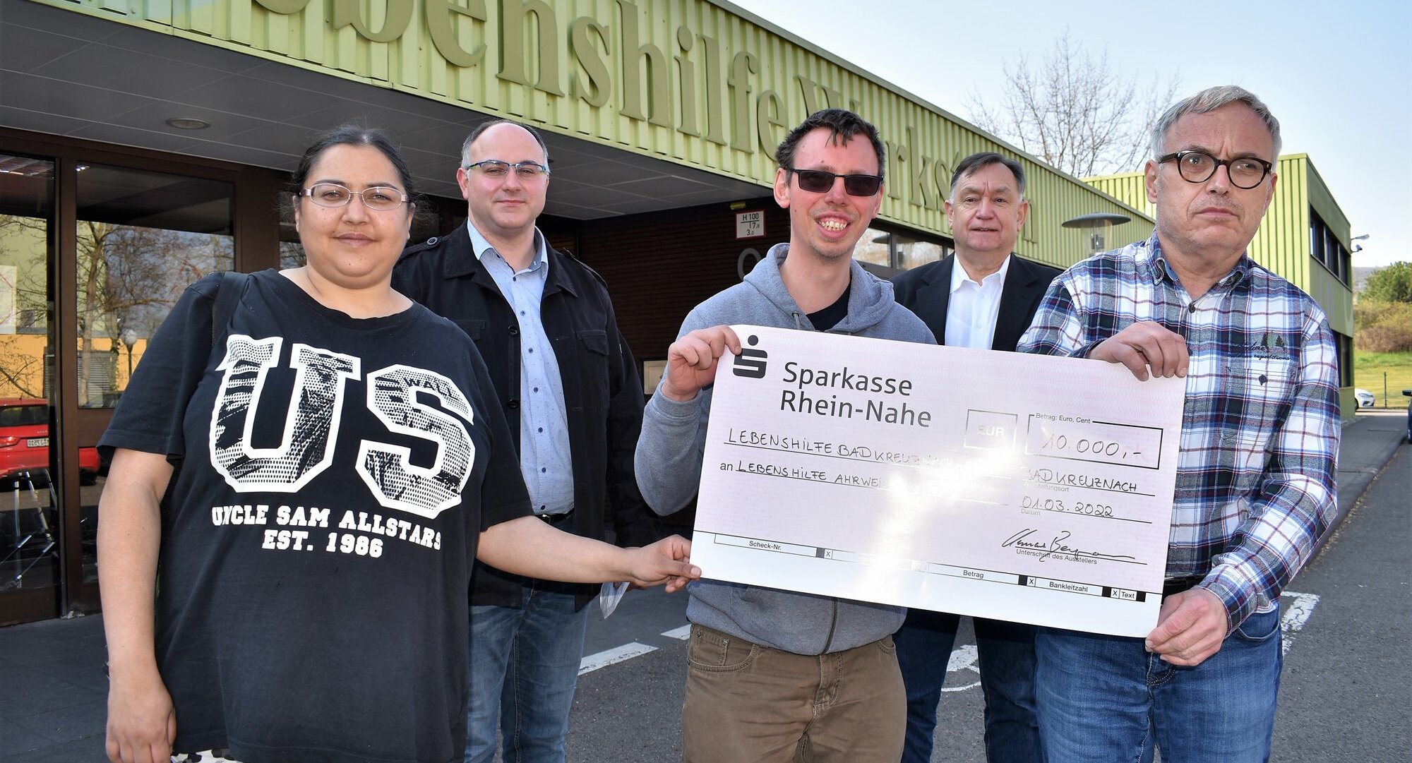 Die Spendensumme geht nun an die Lebenshilfe Kreisvereinigung Ahrweiler, zum Wiederaufbau der Sinziger Einrichtung. "Jeder hat ein bisschen von dem getan, was er gut kann", bedanken sich auch Geschäftsführer Clemens Bergmann und Zweigstellenleiter Sascha Fuchs für das großartige Engagement. Christine Krattner und Reinhold Schneiß nahmen den symbolischen Scheck stellvertretend für die Ahrtaler Kolleg:innen im Namen des Werkstattrats der Lebenshilfe-Werkstätten Bad Kreuznach entgegen, zusammen mit Lukas Dymke, der nach der Flut im Ahrtal Zuflucht in Bad Kreuznach gefunden hat und seither in der Lebenshilfe Werkstatt an der Nahe arbeitet.