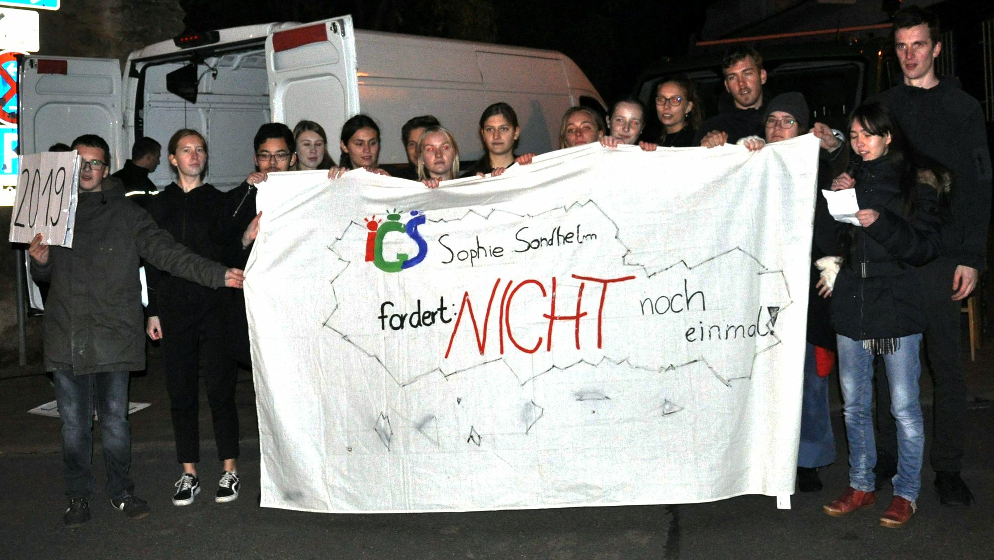 Die Oberbürgermeisterin und der Vorsitzende der jüdische Gemeinde bedankten sich bei der Intergrierten Gesamtschule Sophie-Sondhelm für deren engagierte Gedenk- und Aufklärungsarbeit. In diesem Jahr führten Schülerinnen und Schüler der AG "Schule ohne Rassissmus – Schule mit Courage" und der MSS 13 eine Theaterszene mit dem Titel "Fremde – Freunde – Feinde" auf, welche die zunehmende Entfremdung der Gesellschaft bis zur Diskrimierung und Verfolgung ihrer jüdischen Mitgleider zum Thema hatte. Das stumme Spiel wurde von Zeitungs-Zitaten aus dem Nationalsozialisismus bis hin zu den Äußerungen der AfD-Bundesspitze begleitet.