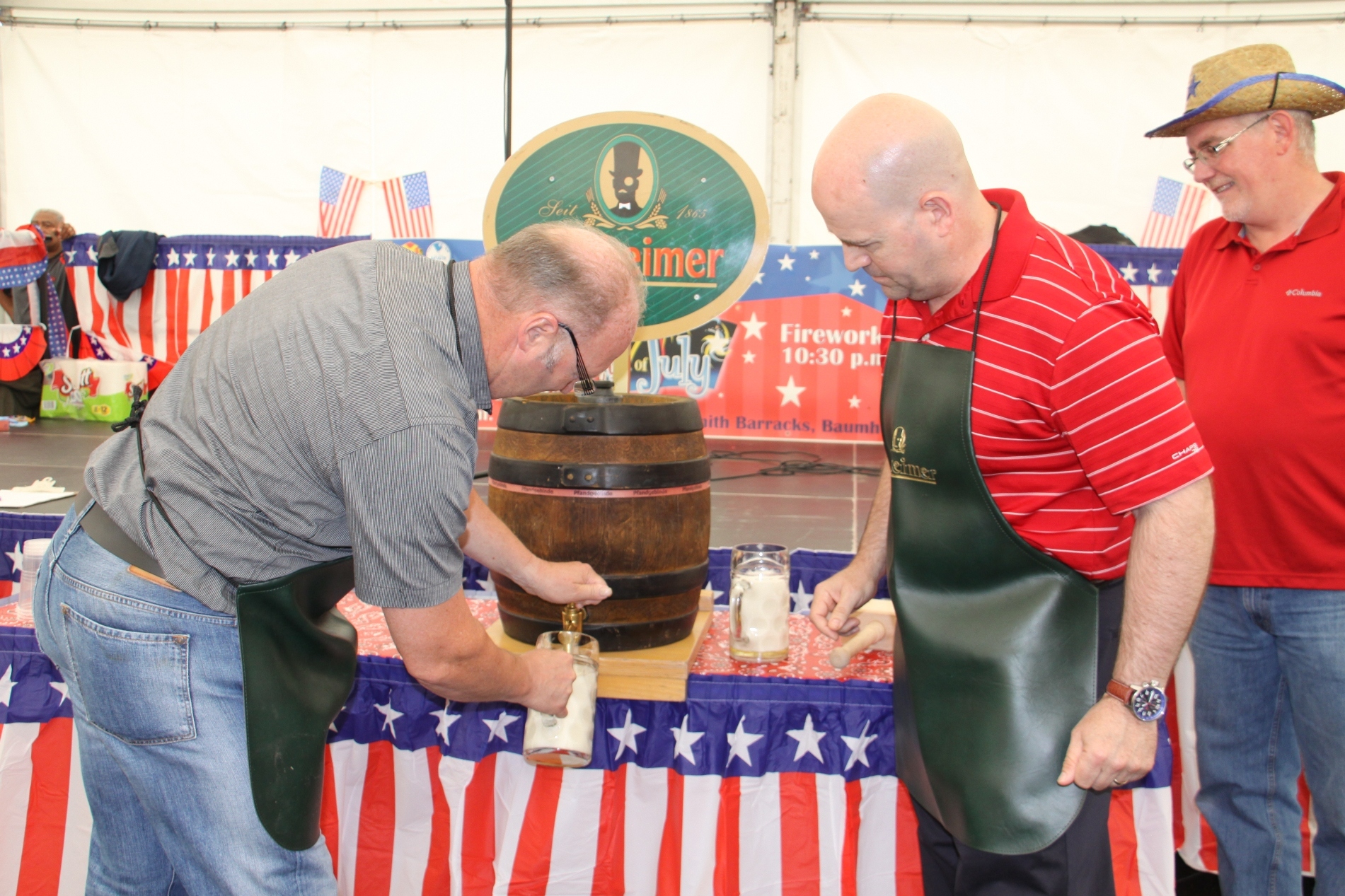 “Auf die Unabhängigkeit und die Freiheit”, sagt Igyarto und stößt mit Alsfasser, dem aktuelle Kommandeur der USAG Rheinland-Pfalz, Oberst G. Shawn Wells dem Bürgermeister der Stadt Baumholder Günther Jung, und dem stellvertretenden Manager der Garnison, Bruce Likens, an. Hunderte Familienangehörige und Soldaten, sind bei trockenem Wetter zum Festplatz vor der US-Sporthalle "Hall of Champions" gekommen und genießen ein sehr abwechselungsreiches Unterhaltungsangebot in Country- und Westernatmosphäre. Kinder basteln und spielen an verschiedenen Ständen, reiten auf Pferden und fahren mit dem Kinderzug. Die Berufsfeuerwehr der US-Streitkräfte in Baumholder sind mit einem Info-Mobil anwesend und informieren die Besucher über Brandgefahr im häuslichen Bereich und deren Bekämpfung. Im Festzelt wetteifern derweil Freiwillige beim Wassermelonen-Wettessen oder beim Stierreiten auf einem mechanischen Bullen um den Sieg. Andere genießen einfach nur ein Eis oder essen typisch amerikanisches Barbeque. In einer sehr entspannten Atmosphäre feiern Amerikaner gemeinsam mit vielen deutschen Gästen - deutsche Zivilbeschäftigte durften zu diesem Anlass ihre Familie und Freunde mitbringen - bis in den späten Abend und erleben das traditionelle Feuerwerk - gemütlich auf einer Decke auf der Wiese rund um das Minick Field und ganz ohne Regen.