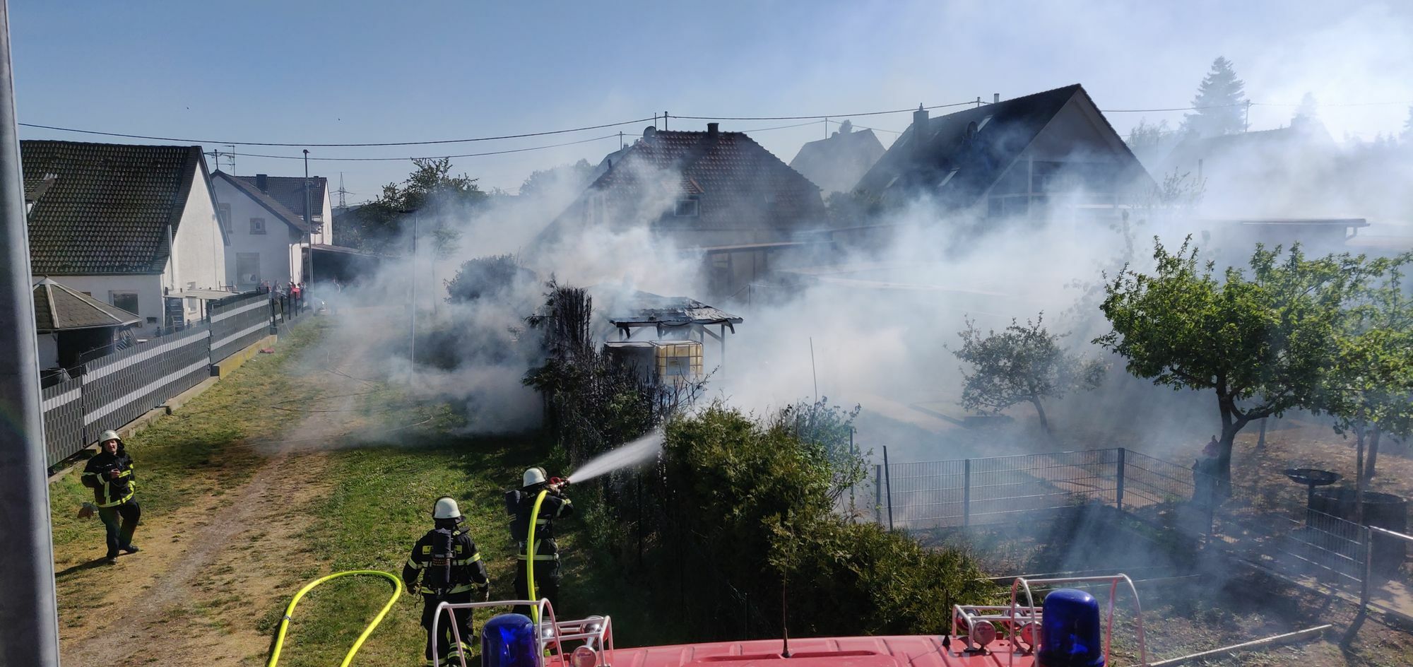 Die Löschbezirke Nord und Süd waren mit insgesamt vier Löschfahrzeugen und 20 Kräften im Einsatz, um die Flammen zu löschen und ein weiteres Ausbreiten des Feuers auf ein angrenzendes Wohngebäude zu verhindern. Eine Gasflasche, die sich auf dem Dach des Gartenhauses befand, musste zunächst gekühlt und dann geborgen werden.