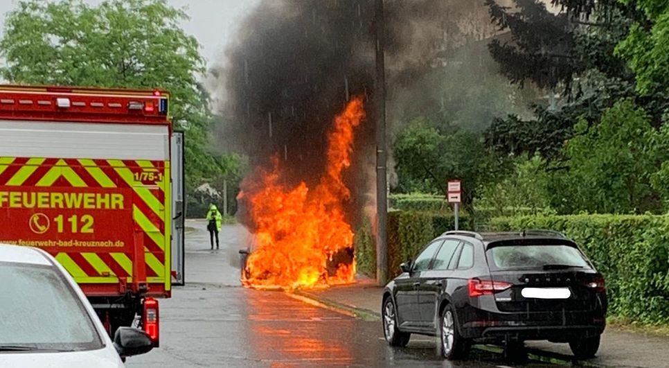 Lichterloh brannte gestern Mittag ein Pkw in der Waldalgesheimer Straße. Der Fahrer bemerkte das Feuer während der Fahrt, hielt an und konnte das Auto noch rechtzeitig verlassen. Daraufhin alarmierte er die Feuerwehr.