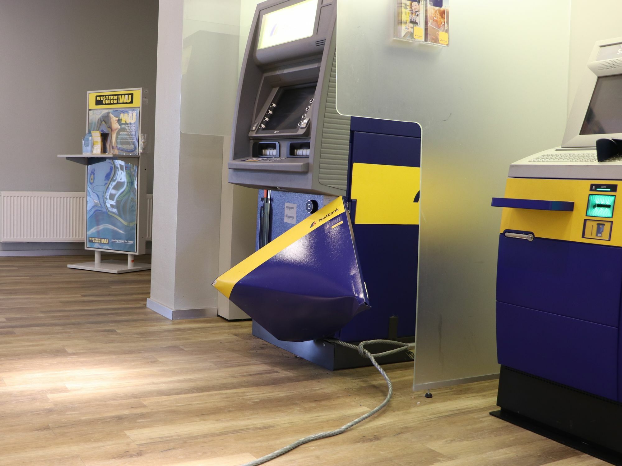 Der filmreife Plan: Mit einem großen Stein warfen die Täter die Glasscheibe der Hintereingangstür der Filiale ein und verschafften sich so Zugang. Dann umwickelten die Unbekannten einen Geldautomaten mit einem Anschlagseil - dessen anderes Ende sie offenbar an der Anhängerkupplung ihres Fahrzeugs befestigten. Allerdings scheiterte das Vorhaben - vermutlich an der nicht ausreichenden Zuglast der Anhängerkupplung. Die Täter flüchteten unerkannt und ohne Beute. Der Diebstahlversuch muss sich zwischen Samstag, 13 Uhr, und Montag, 7.45 Uhr, ereignet haben. Die Kriminalpolizei Bad Kreuznach bittet um Hinweise aus der Bevölkerung: Wer hat verdächtige Beobachtungen gemacht, kann das Seil identifizieren, dass die Täter am Tatort hinterließen oder hat ein Fahrzeug mit beschädigter Anhängerkupplung bemerkt? Hinweise nimmt die Polizei über Telefon 06 71 / 8 81 11 00 entgegen.
