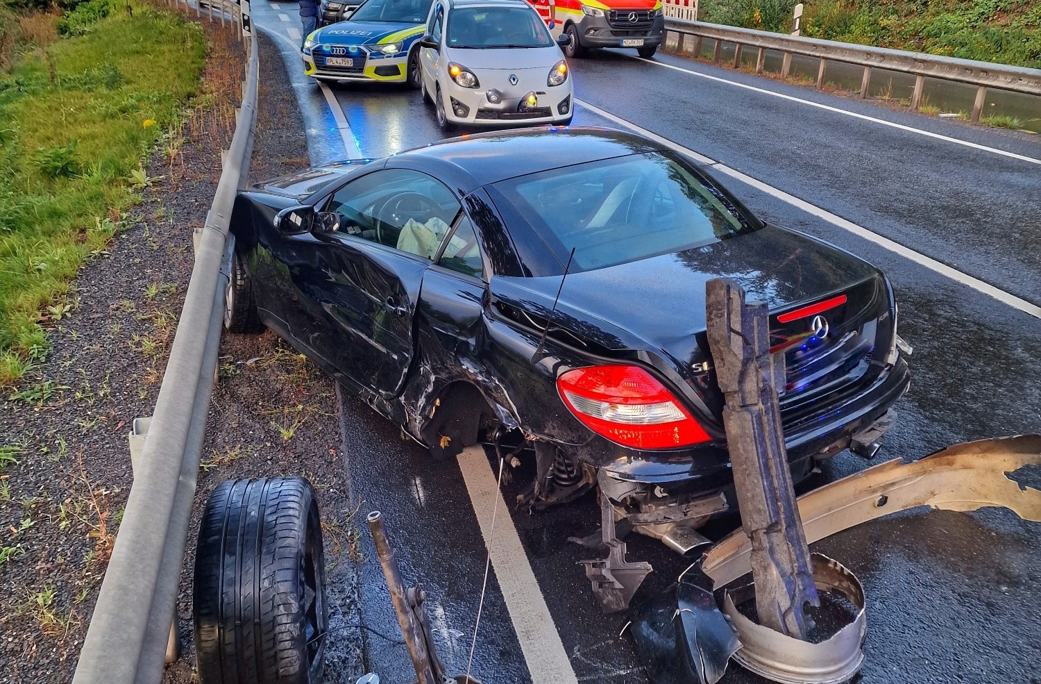 Beide Frauen zogen sich bei dem Verkehrsunfall glücklicherweise nur leichte Verletzungen zu. Die Trümmerteile verteilten sich auf rund 150 Metern Strecke. Unter anderem hatte die Wucht des Aufpralls das linke Hinterrad des Mercedes samt Achsenteilen herausgerissen. Im Einsatz waren Feuerwehrleute aus Bad Kreuznach, Simmertal, Hochstetten-Dhaun und Kirn. Die B 41 blieb rund 60 Minuten voll gesperrt.