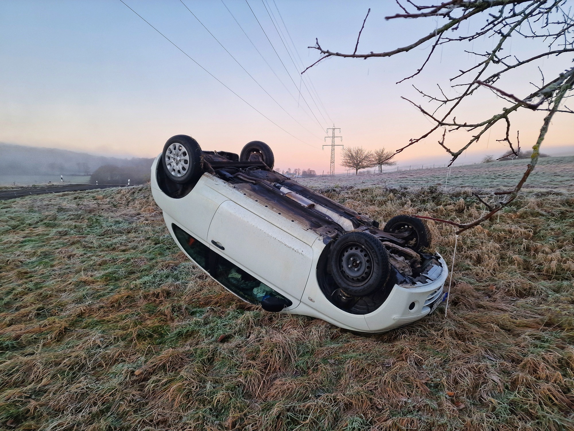 Gegen 7.20 Uhr kam eine Frau auf der Kreisstraße 9 zwischen St. Johannisberg und Dhaun von der Fahrbahn ab. Sie schleuderte eine Böschung hinab und kam auf dem Dach zum Stehen. Die Straßen rund um Kirn sind teilweise spiegelglatt.