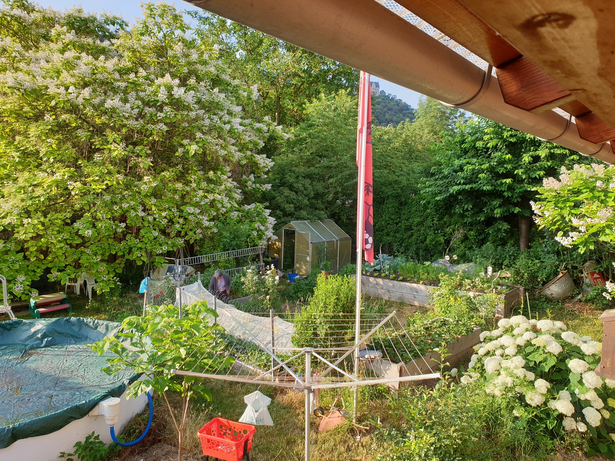 Ein Garten mit vielen Bäumen, Sträuchern mit unendlich vielen Blüten. In Hochbeeten finden wir viele Gemüsepflanzen sowie Kräuter aus biologischem Anbau. Ohne umweltkritischem Transport vom Beet in den Topf, die Pfanne oder in das Einweckglas. Der Pool wird seit 2 Jahren wegen der Trinkwasser-Situation nicht in Betrieb genommen.