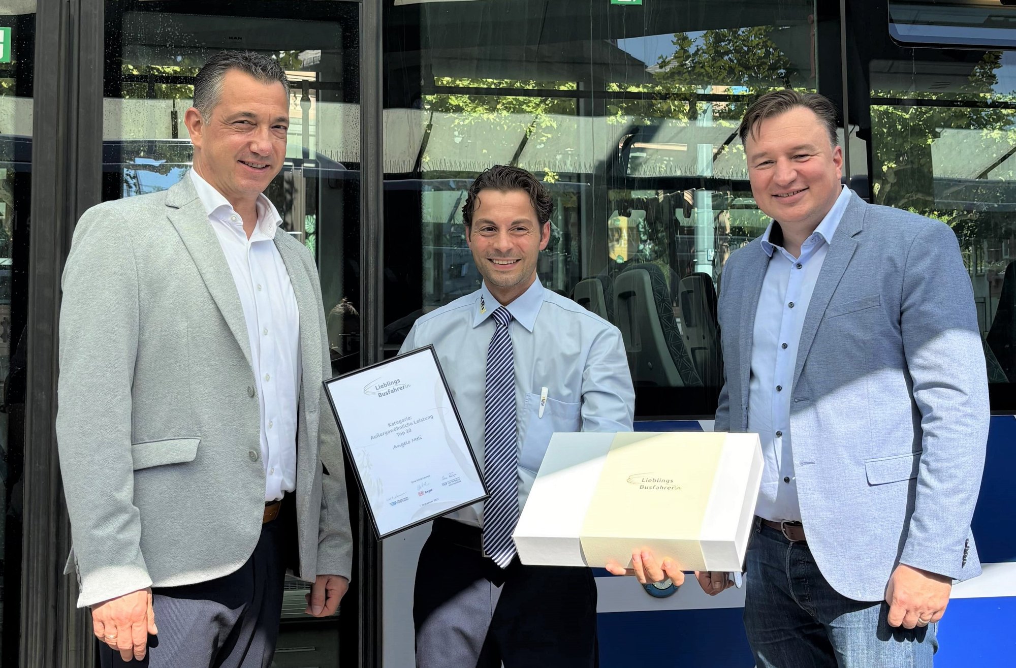 Busfahrer Angelo Meli (M.) nimmt die Auszeichnung von Emanuel Letz (l.) und Uwe Hiltmann entgegen.
