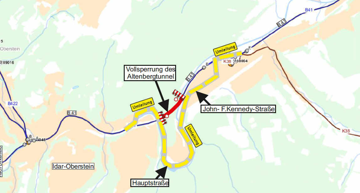 Der Landesbetrieb Mobilität (LBM) Bad Kreuznach teilt mit, dass am Donnerstag, 14. Mai, von 8.30 Uhr bis 16 Uhr der Altenbergtunnel im Zuge der B 41 bei Idar-Oberstein voll gesperrt wird.