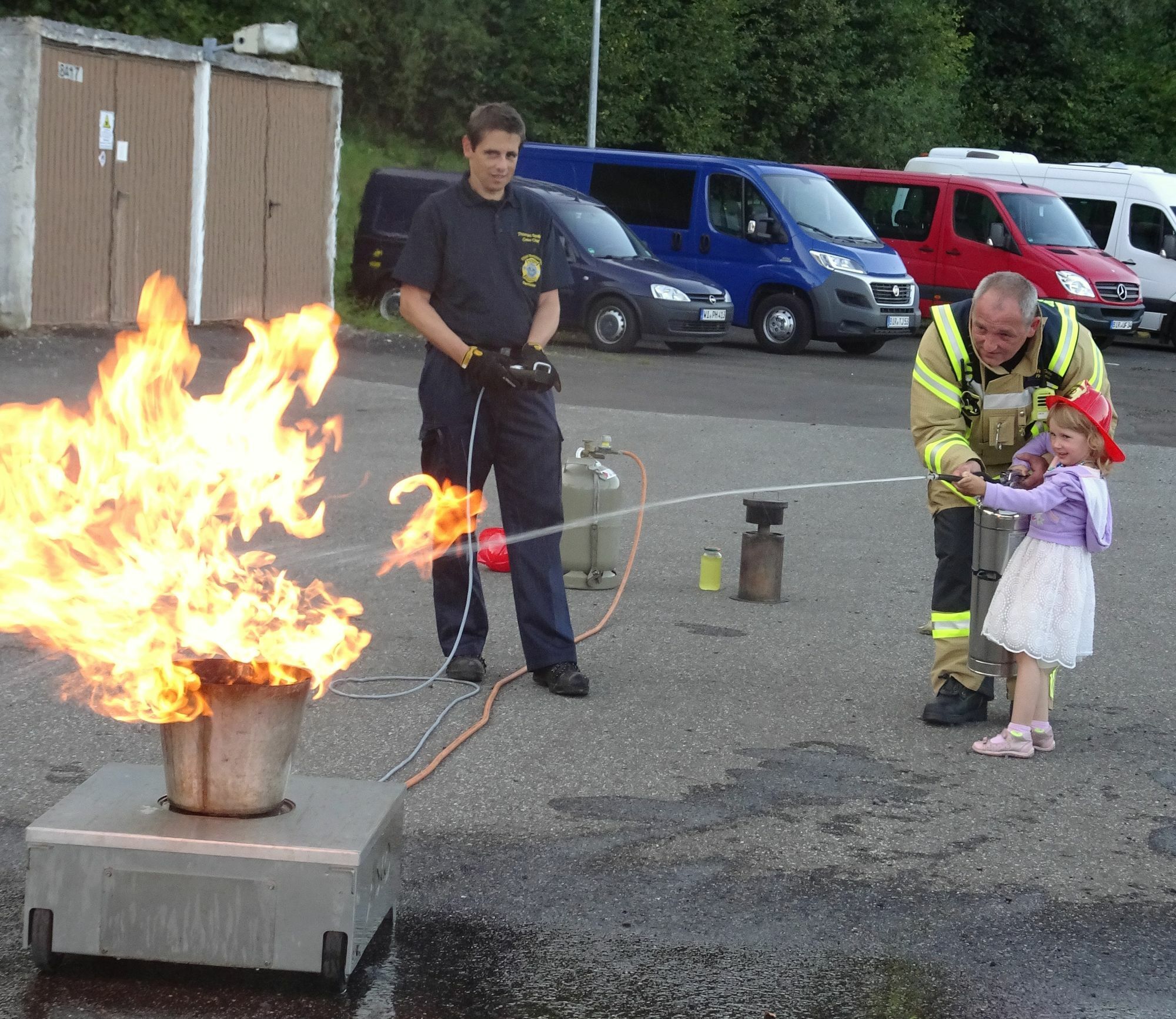 Die Präsentation konnte weitergehen. Der Leiter der US-Berufsfeuerwehr, Wolfgang Veeck, und der Stationsleiter, Sascha Weber, hatte die Stammtischler nun zum zweiten Mal eingeladen. In der US-Gemeinde demonstrierten die Wehrleute den deutschen und amerikanischen Gästen aber nicht nur die Drehleiter, sondern auch, wie man einen Mülleimerbrand richtig löscht und was passiert, wenn Fett brennt. "Der Beruf des „Fire-Fighters“ ist nicht immer einfach, denn auch wir erleben nicht nur schöne Dinge", sagt Weber als er den Gästen den Einsatzablauf erklärt. „Wir machen nicht nur Brandbekämpfung, sondern koordinieren auch alle im US-Bereich anfallenden medizinischen Einsätze und rücken aus,“ ergänzt der diensthabende Crew-Leiter Thomas Spallek. "Es ist toll, wieviel Zeit sich die Feuerwehr für uns nimmt", lobte Stammtisch-Stammgast Nicole Bier. Die Gäste durften sich auch selbst an dem Feuerlöscher versuchen. Dabei hatten nicht nur die zwei kleinen Gäste - Emilia ist vier Jahre alt, Renée drei - ihren Spaß. Auch den Erwachsenen stand die Freude ins Gesicht geschrieben. Insgeheim möchte anscheinend jeder gerne Feuerwehrmann werden. Der Stammtisch trifft sich in der Regel jeden Mittwoch um 18.30 Uhr im Hotel Stern. Hin und wieder stehen besondere Themen auf dem Stammtisch-Programm, wie nun eben der Besuch bei der Berufsfeuerwehr.