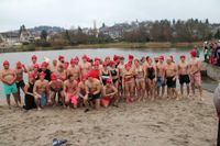 Da war das Wasser sogar wärmer als die Außentemperatur. Zwei Grad am Sandstrand, sechs Grad im Weiher. So waren die äußeren Bedingungen beim zehnten Neujahrsschwimmen der DLRG Baumholder. 50 Männer und Frauen trotzten der Kälte und wagten am Sonntag den kurzen Sprung ins kühle Nass. Das Event, die "Eröffnung der Badesaison", wie es Günter Heinz von der DLRG scherzhaft nennt, lockt mittlerweile nicht nur Besucher aus der Verbandsgemeinde Baumholder an. "Viele Schwimmer kamen auch aus Birkenfeld, dem Kreis Kusel und einige aus Bad Kreuznach", erzählt Jonas Bickler, der stellvertretende Vorsitzende der DLRG-Jugend, die die Veranstaltung Jahr für Jahr organisiert. Und er fügt hinzu: "Auch einige Amerikaner waren dabei." Über die gute Resonanz freut sich auch Yaro Schranz, der Vorsitzende der DLRG-Jugend: "Wir sind froh, dass unser Event so gut angenommen wird, auch von den Zuschauern. Wir hätten nicht mit so viel Betrieb gerechnet." Tatsächlich ist es schon vor 14 Uhr, als der Startschuss fällt, voll rund um das Gewässer. Die Besucher wärmen sich mit Glühwein oder Kinderpunsch oder stärken sich mit Gegrilltem oder frischen Waffeln. Um 13.50 Uhr heißt es dann: umziehen und aufstellen am Sandstrand.