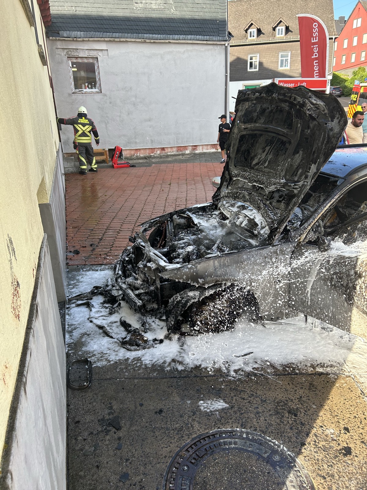 Birkenfeld. Ein Auto brannte aus noch ungeklärten Gründen an der Birkenfelder Esso-Tankstelle.