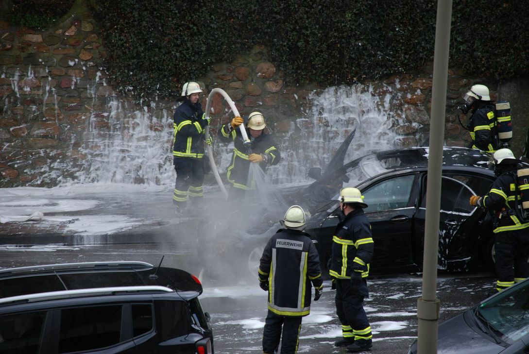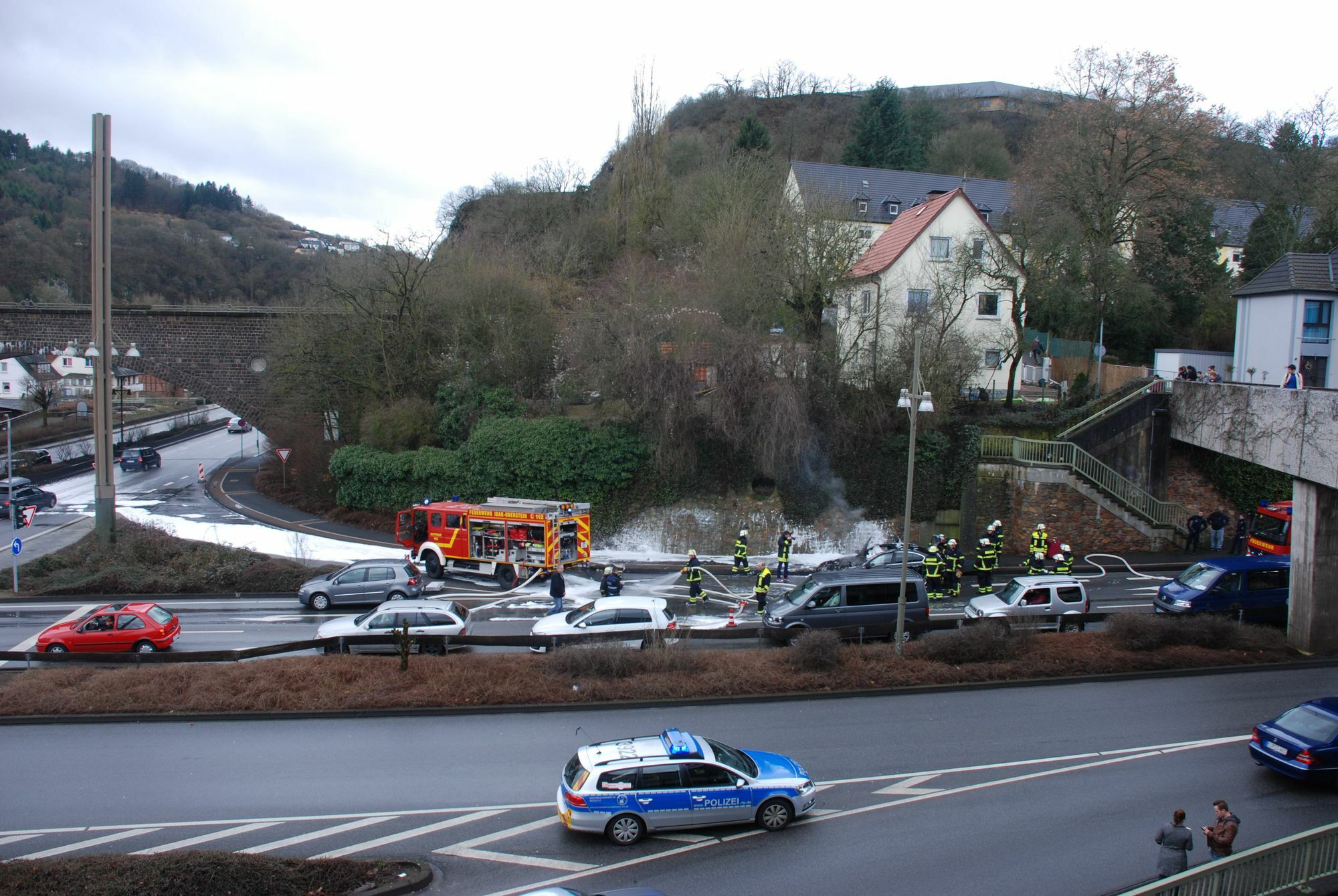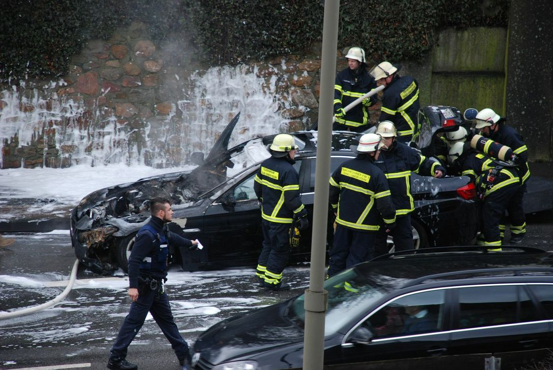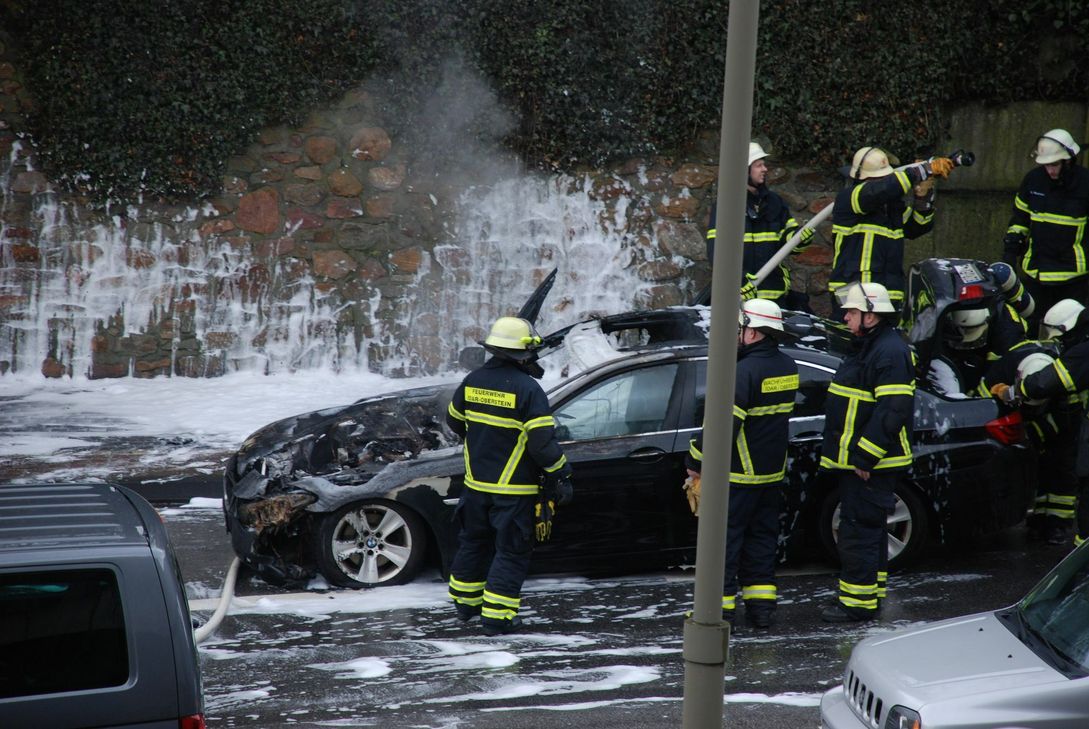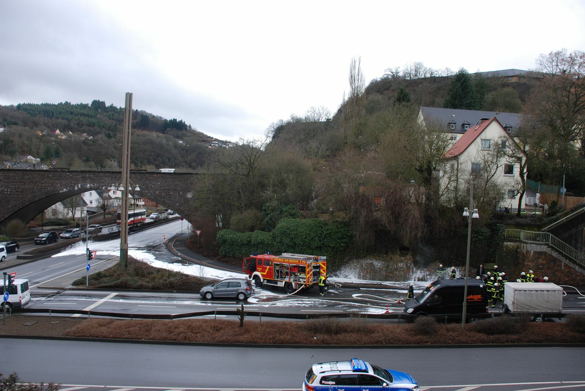 Die Feuerwehr war sofort vor Ort und löschte das Fahrzeug ab, ein dicker Schaumteppich bedeckt zurzeit noch die Straße. Bericht folgt!