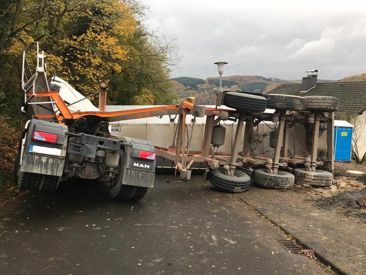 Aufgrund des unzureichend verdichteten Bodens senkte sich der Untergrund unterhalb des rechten Reifens der hinteren Achse ab. Durch die eingetretene Gewichtsverlagerung kippte der Anhänger nach rechts auf die Fahrbahn um. Die gesamte Ladung wurde über beide Fahrspuren verstreut. Der Fahrer befand sich während dessen in der Fahrerkabine und blieb glücklicherweise unverletzt. Jedoch entstand nach erster Einschätzung ein Sachschaden am LKW-Gespann von mindestens 80.000 Euro.