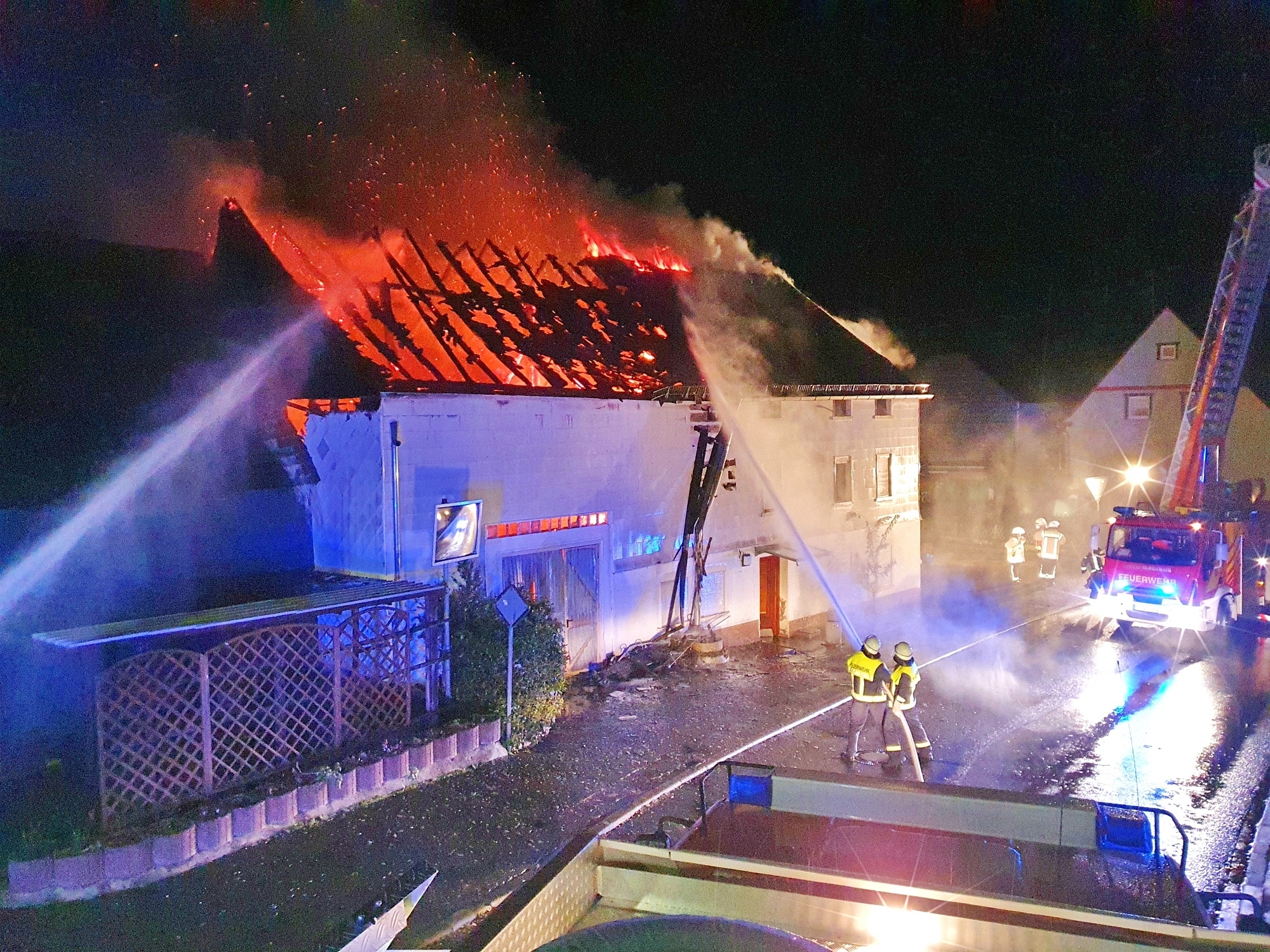 „Wir haben das Knistern wahrgenommen, öffneten die Klappe des Speichers und dort war bereits alles voll Rauch. Da stellten wir den Feuerlöscher bei Seite, meine Frau und ich verließen sofort das Gebäude“, berichtete der Bewohner. „Auf dem Weg zum Feuerwehrhaus sah ich durch die Fenster der Garage ein hellen Flammenschein, unter dem Dach leuchtete es bereits auch, als wir binnen Minuten mit den Bundenbacher Kameraden vor Ort eintrafen schlugen bereits meterhoch die Flammen aus dem Dachstuhl“, so Feuerwehrmann Ingolf Mörscher.