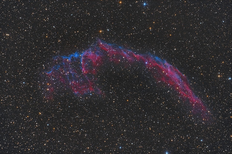 Das Bild zeigt die Knochenhand. Die blauen Strukturen im Nebel gehen vom doppelt ionisierten Sauerstoff und die roten von den H-Alpha-Emmissionen des Wasserstoffs aus. Die Cirrusnebel sind eine Ansammlung von filigranen Emmissions- und Reflektionsnebeln, diese sind ein Überrest von einer Supernova, die sich vor circa 18 000 Jahren ereignete. Für die Aufnahme verwendete Heyderich das Newton-Teleskop 150/175 auf einer eq5 mit der Canon 450da. Das Bild entstand Ende September über Kempfeld.