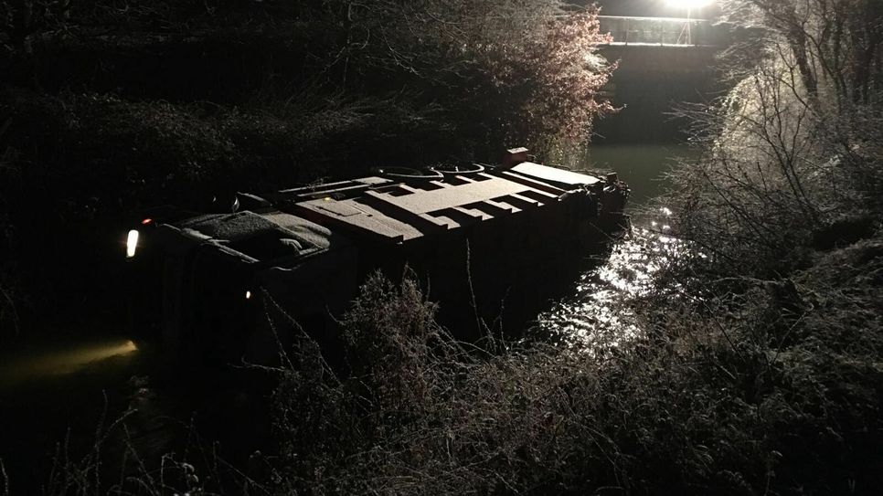 Der Fahrer verlor schließlich die Kontrolle über das Fahrzeug. Der LKW rutschte geradeaus weiter, über eine etwa 5 Meter hohe Böschung hinab in den etwa 6 Meter breiten Mühlengraben (Seitenarm des Glans). Das Fahrzeug prallte zuerst mit dem Führerhaus ins Wasser, kippte anschließend um und kam auf der Fahrerseite im Wasser zum Liegen. Die drei Fahrzeuginsassen konnten sich selbstständig befreien. Drei Insassen konnten sich befreien Sie wurden nach ersten Erkenntnissen leicht verletzt und durch die Kräfte des Rettungsdienstes zur Untersuchung nach Bad Kreuznach ins Krankenhaus verbracht. Soweit bislang bekannt sind augenscheinlich keine Betriebsstoffe ausgelaufen, der LKW war zum Unfallzeitpunkt noch nicht beladen. Für die Bergung mussten insgesamt zwei Autokranwagen angefordert werden. Zur Einsatzbewältigung waren ferner 26 Kräfte der Feuerwehren aus Bad Sobernheim, Odernheim und Staudernheim vor Ort eingesetzt. Nach ersten Schätzungen beläuft sich die Schadenssumme auf circa 60000 Euro.
