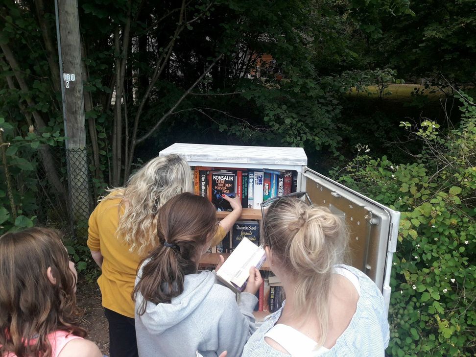 Zwischenzeitlich entwickelte sich in der Monzinger Metzgerei Benno Alt ein Büchertauschtisch, ein weiteres Zeichen für den Bedarf einer solchen Einrichtung. Den tauglichen Innenausbau des alten Verteilerkastens vollzog nun Heiko Zimmermann, der ihn auch gleich grundierte, damit Conni Hoseus ihn so wunderschön gestalten konnte. Andreas Steitz vom Gemeindebauhof stellte den notwendigen Sockel im Entrainspark auf. Die Familien Zimmermann und Hoseus konnten den schmucken Bücherschank nun darauf montieren und übernahmen gleich auch noch die Erstausstattung. Und nun läuft der Büchertausch so langsam an. Jeder darf sich hier bedienen, ein oder gleich mehrere Bücher entnehmen und jeder darf auch Bücher hier hineinstellen, damit andere sie lesen können. Einfach so und kostenfrei.