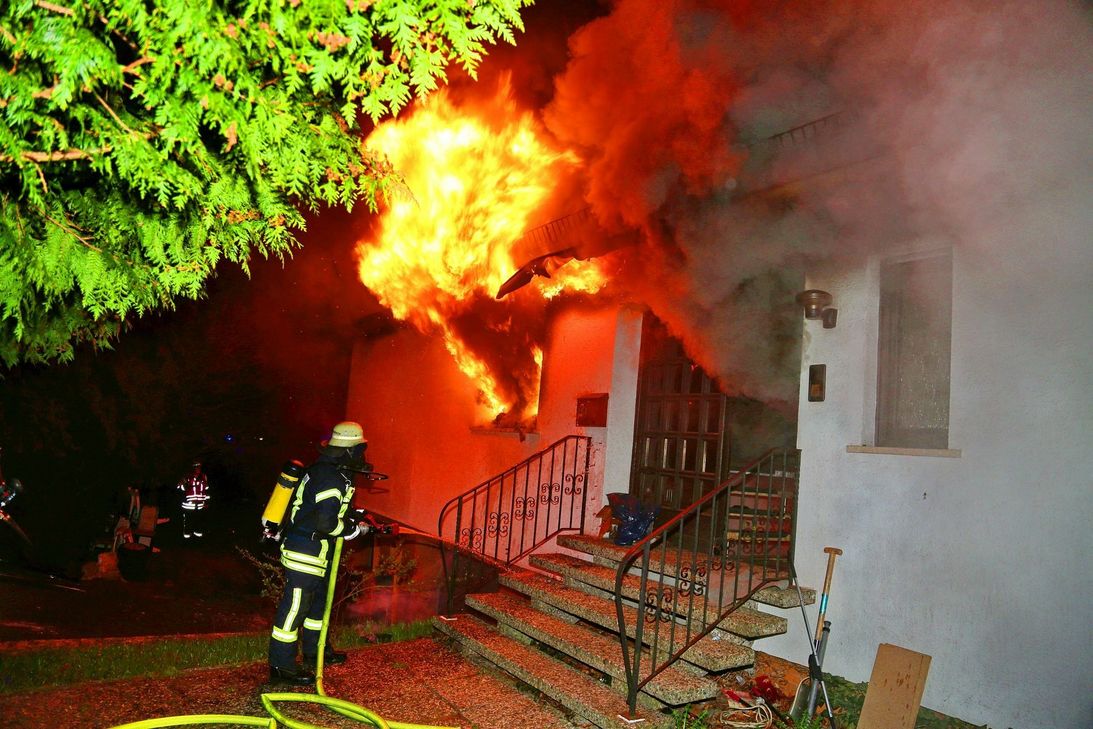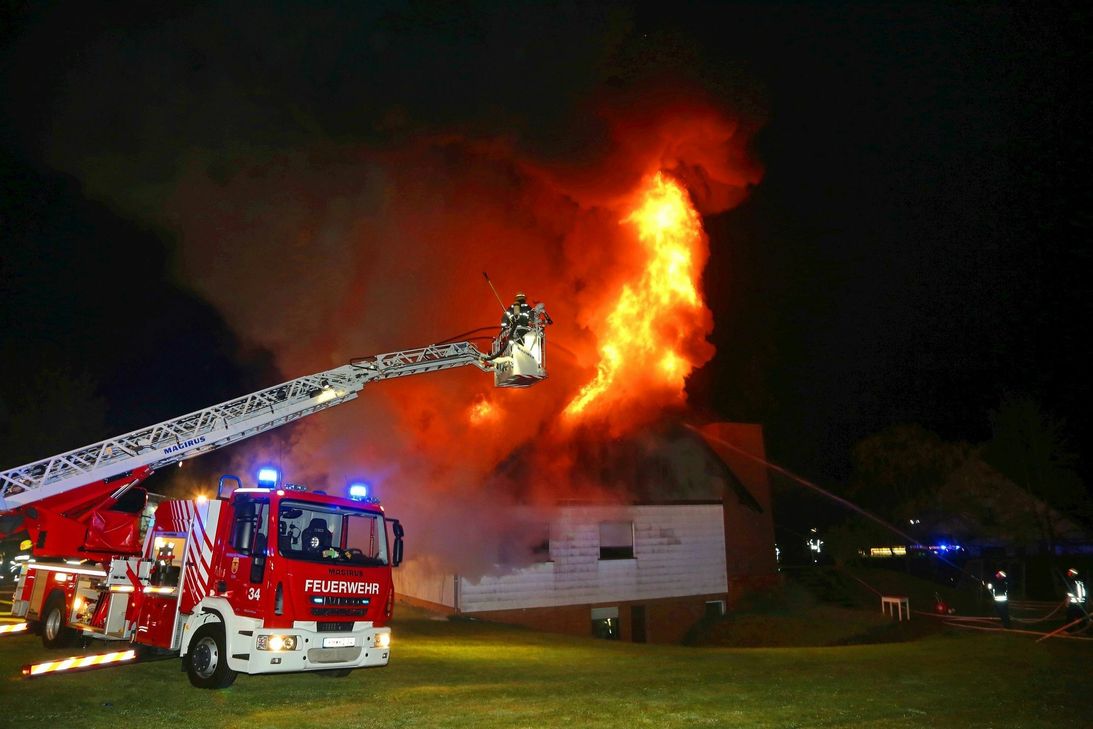 Als die Wehrleute an kamen, schlugen ihnen meterhohe Flammen entgegen, aber der Vater und seine zwei Kinder konnten sich im letzten Augenblick ins Freie retten. „Mein Kleinster weckte mich und schrie panisch laut: "Papa wach auf, es brennt im Haus“, berichtet der Vater. „Das Feuer breitete sich so schnell im gesamten Haus aus und griff dann direkt auf das Dach über“, berichtete ein Feuerwehrmann. Als die Feuerwehrleute mit zahlreichen Fahrzeugen unter der Führung von Einsatzleiter Nils Heidrich eintrafen, stand das Erdgeschoss im Vollbrand. Sechs Meter hohe Flammen Nach 60 Minuten hatte sich das Feuer in das Dachgeschoss ausgebreitet und es kam zu einer Durchzündung des Dachstuhls. Es schlugen bis zu sechs Meter hohe Flammen aus Dach- und anderen Fenstern sowie sonstigen Öffnungen, Feuerschein und Brandgeruch war in großen Teilen der Nachbargemeinden wahrnehmbar. Das Großaufgebot von über 100 Rettungskräften sorgte dafür, dass die rund 200 Schaulustigen den Brandort während des Einsatzes in gebührendem Abstand beobachteten. Die Feuerwehrleute konnten die Flammen durch massiven Wassereinsatz relativ schnell unter Kontrolle bringen. Schwieriger gestalteten sich die Nachlöscharbeiten in der Dach Isolierung des Wohnhauses. Sämtliche Klappen, Fenster, Isolierungen und Öffnungen wurden geöffnet, um die Glutnester abzulöschen. Gasflaschen ins Freie transportiert Zu Beginn wurde die Werkstatt von den Atemschutzträgern durchsucht und ein Schweißgerät mit Gasflaschen ins Freie transportiert. Mehrere der Einsatzkräfte gingen dabei unter umluftunabhängigen Atemschutz vor, um das brennende Wohnhaus von innen zu löschen. Von dem Erdgeschoss, aus dem das Feuer ausbrach, breiteten sich die Flammen binnen weniger Minuten rasend schnell aus, und es blieb nicht mehr viel vom Wohnhaus übrig. Verbrannte, verschmorte und verkohlte Wohnungseinrichtung, geschmolzene Gartenmöbel, herabhängende Kabel und überall Ruß. Verletzt wurde infolge des Brandes niemand. Nach gut vier Stunden hatten die Feuerwehrleute die letzten Glutnester gelöscht. Brandexperten werden das Wohnhaus nun in Augenschein nehmen. Fotos: Sebastian Schmitt