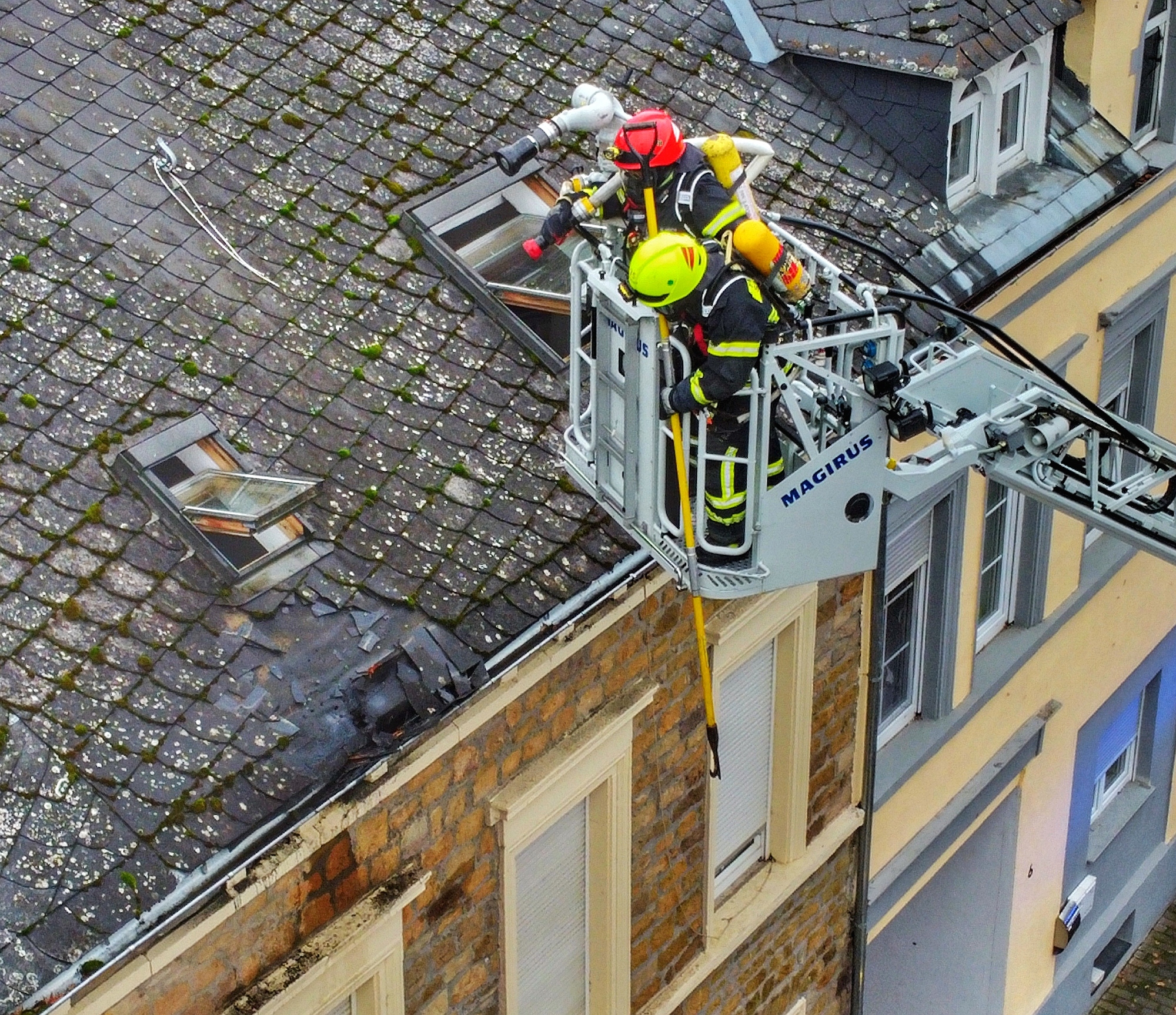Beim Eintreffen der Feuerwehr waren bereits kleinere Flammen am Dachstuhl zu sehen. Die Wehrleite brachten das Feuer, das bereits auf die Dachisolierung übergegriffen hatte, schnell unter Kontrolle und konnten ein Ausweiten der Flammen in der eng bebauten Hahnenbachstraße verhindern.