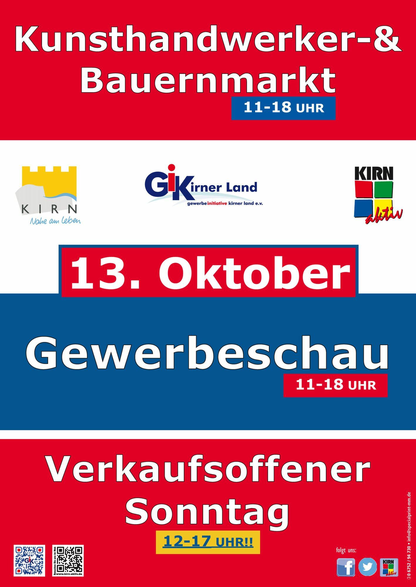 Parallel findet auch in diesem Jahr wieder die Gewerbeschau der „Gewerbeinitiative Kirner Land“ statt. Im großen Zelt auf dem Parkplatz Amthofstraße stellen zahlreiche Unternehmen aus der Stadt und Verbandsgemeinde sich und ihre Produkte vor. Begleitet wird der Kunsthandwerker- und Bauernmarkt traditionell mit einem verkaufsoffenen Sonntag der Werbegemeinschaft „Kirn aktiv“. Sie sind daher herzlich eingeladen, neben der Teilnahme am bunten Markttreiben zwischen 12 und 17 Uhr auch das attraktive Angebot des Kirner Einzelhandels zu erleben und zu nutzen.