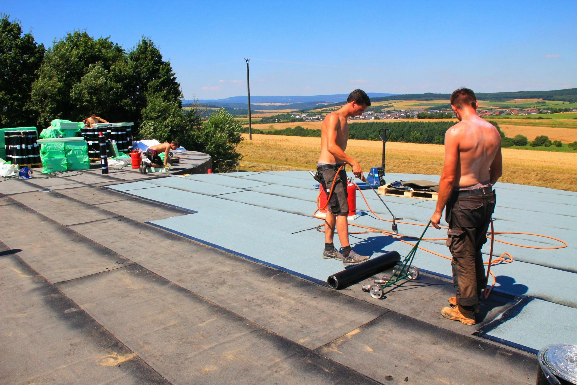 Die fünf Arbeiter schaffen an dem vermutlich heißesten Tag des Jahres auf dem Dach des Hochbehälterneubaues nördlich von Oberhausen. Auf der 300 Quadratmeter großen Fläche gibt es nicht den Ansatz eines schattigen Ecks, es gibt dort oben nicht mal ein Eck. Die Sonne brennt auf die Arbeiter nieder. In der Gluthitze schweißen sie Bitumenplatten zusammen und arbeiten dabei mit Brennern, die etwa 800 Grad haben. Einer schweißt in einer Ecke des Daches die nächsten Platten zusammen. Das Feuer erhitzt die ohnehin heiße Luft um ihn herum noch weiter, aus dem Spalt fließt ein Rinnsal flüssigen schwarzen Bitumens. Schwitzen beim Schweißen Der Boden auf dem Dach ist bereits mit Platten belegt, das Material ist so heiß, dass jeder Schritt in den schweren Arbeitsschuhen unangenehm ist. „Mir brennen die Füße“, ist zu hören. Der Hochbehälter wird mit 10 cm dickem Styroporplatten isoliert und dann mit 2 Lagen Bitumenbahnen abgedichtet. Wenn die 5 Arbeiter in 14 Tagen fertig sind, wird fast das gesamte Bauwerk mit Erde bedeckt werden. Der Hochbehälter, der rund 50 Meter östlich der alten Anlage entsteht, erschließt neue Dimensionen. 1 100 Kubikmeter unterteilen sich auf zwei innen jeweils 12,5 Meter Durchmesser "dicke" Kammern, versorgt werden die Gemeinden Oberhausen, Hennweiler, Hahnenbach, Heinzenberg, Hochstetten-Dhaun (Ortsteile Karlshof, St. Johannisberg und Dhaun) sowie der Stadtteil Kallenfels. 22 Hochbehälter Das Volumen des neuen HB beträgt 1.100 m³, der bisherige HB ist Baujahr 1954 und hat ein Volumen von 550 m³. In der Verbandsgemeinde Kirn-Land sichern 22 Hochbehälter mit einem Gesamtvolumen von 4 800 cbm die Versorgung mit Trinkwasser. Ein Leitungsverbundsystem ermöglicht die wechselseitige Versorgung im Bedarfsfall. Foto: Sebastian Schmitt