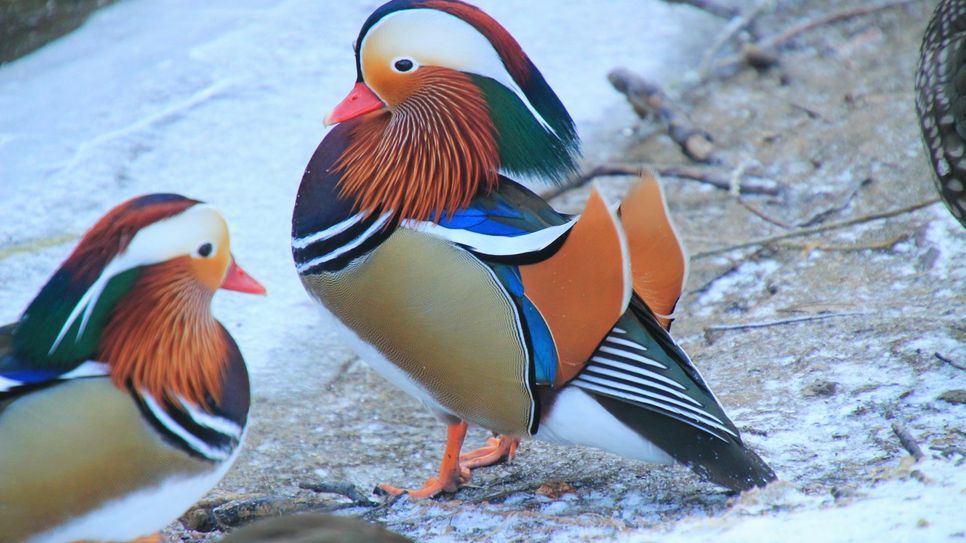 Besonders in der winterlichen Landschaft, fallen die „Japanische Enten“ sehr auf. Bereits letztes Jahr hat sich eine Familie Nilgänse bei den einheimischen Stockenten angesiedelt, jetzt kamen die Mandarinenten dazu. Die Heimat der Mandarinente liegt in Ostasien, mittlerweile ist ihr Anblick in einigen europäischen Parks jedoch keine Seltenheit mehr. Die dort lebenden Exemplare sind meist Nachkommen von entlaufenen Zuchttieren, sie gehört hier also zu den Neozoen. Neozoen sind Tiere, die in der Neuzeit mit Hilfe des Menschen nach Europa kamen. Nachkommen entlaufener Zuchttiere Die Mandarinenten sind wohl mit die schönsten Vögel, die es in Deutschland gibt. Für viele Menschen sind sie die schönsten Vögel überhaupt. Das Gefieder der Erpel ist wesentlich auffälliger als das der weiblichen Tiere. Das Prachtkleid, das während der Brutzeit getragen wird, zeigt sich am auffälligsten am Kopf: Der Schopf glänzt grün-metallisch oder blauschwarz und über den Augen ist ein breiter weißer Streifen sichtbar. Die orange-braunen Federn am Hals stehen etwas ab. Das restliche Gefieder ist orangebraun, weiß und schwarz, die unterschiedlichen Farbflächen sind klar voneinander abgegrenzt. Außerhalb der Balz ist das Männchen weniger bunt, jedoch immer noch auffälliger als bei dem grauen Weibchen. Auffällig bei Männchen und Weibchen ist der weiße Ring um die Augen. Acht Pärchen paddeln auf der Nahe Auf der Nahe paddeln acht Mandarinentenerpel Richtung Hahnenbachmündung. Ein Weibchen fliegt ein und die Erpel fangen an, sich gegenseitig zu verfolgen. Hektisch schleudern sie immer wieder ihre Köpfe nach oben, um die anderen Erpel und das Weibchen zu beeindrucken. Mandarinenten sind in Deutschland nach wie vor selten. Sie haben es bisher nicht geschafft sich stark zu vermehren. In der Umgebung von Berlin gibt es die größten Bestände in Deutschland (einige hundert Tiere). In einigen anderen Staaten in Europa gibt es mehr Mandarinenten - insgesamt etwa 15 000 bis 20 000. Foto: Sebastian Schmitt