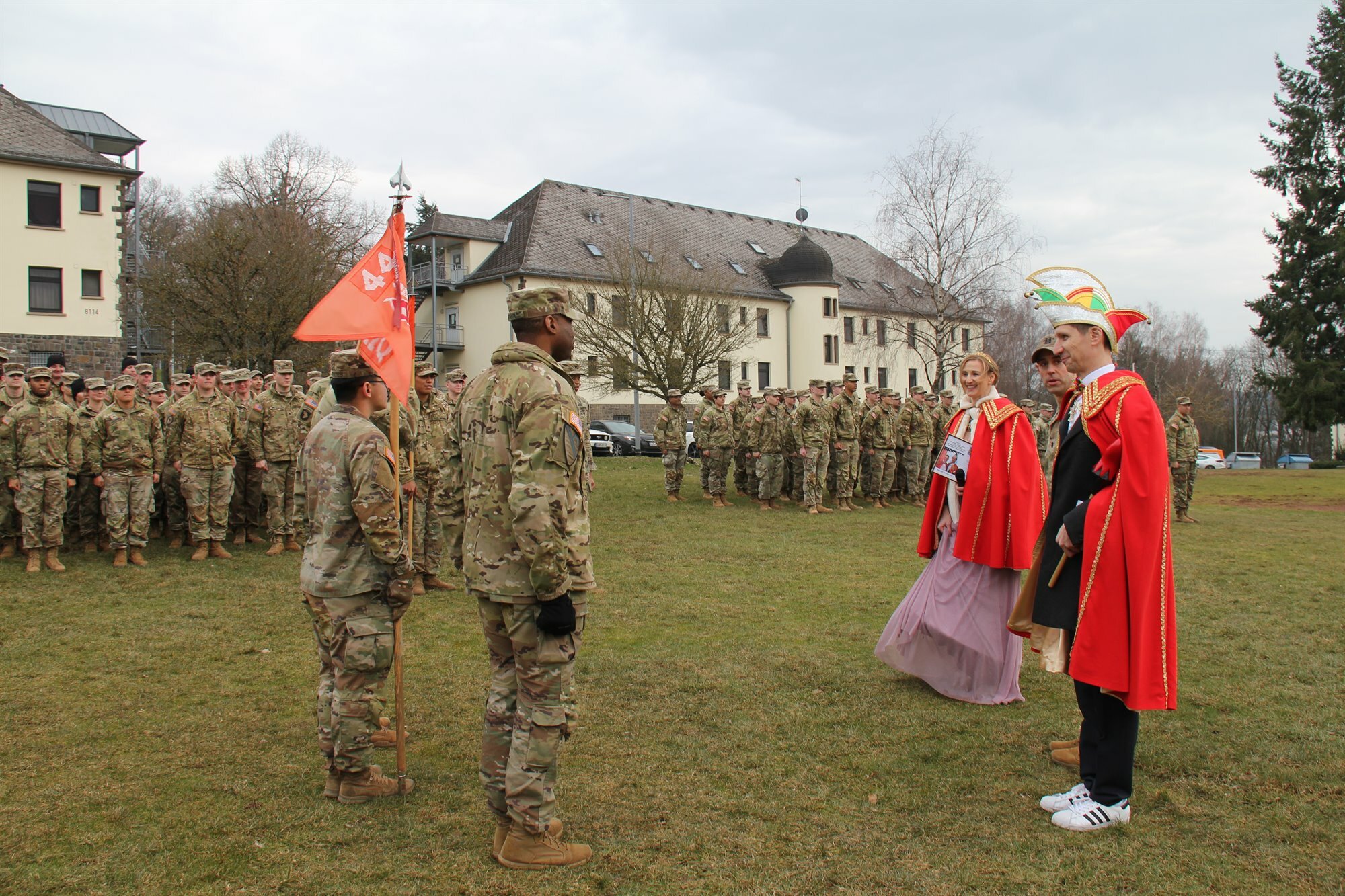 Mehr als 300 Soldaten. Lieutenant Colonel Jeffrey Keenan hat sie an diesem regnerischen Nachmittag antreten lassen. Und das nur aus einem Grund: um die Macht abzugeben. An das Prinzenpaar der Baumholderer Karnevalsgesellschaft (BKG), Birgit I. und Sven I.. Mit dabei auch der stellvertretenden Garnisonsmanager Jae Kim, der sich ebenfalls der Fastnachtstradition beugte. Die Tollitäten schritten gemeinsam mit Keenan die Reihen ab und überreichten die Entmachtungsurkunde an Keenan und Command Sergeant Major Roy Orren. "Das ist ein großartiges Event, das uns die Möglichkeit gibt, deutsche Traditionen zu erleben", sagte Keenan begeistert. Garnisonsmanager Kim bedankte sich bei der BKG-Delegation für den Besuch und freute sich, dass die Fastnacht auch in der US-Militärgemeinde Einzug gehalten hat.