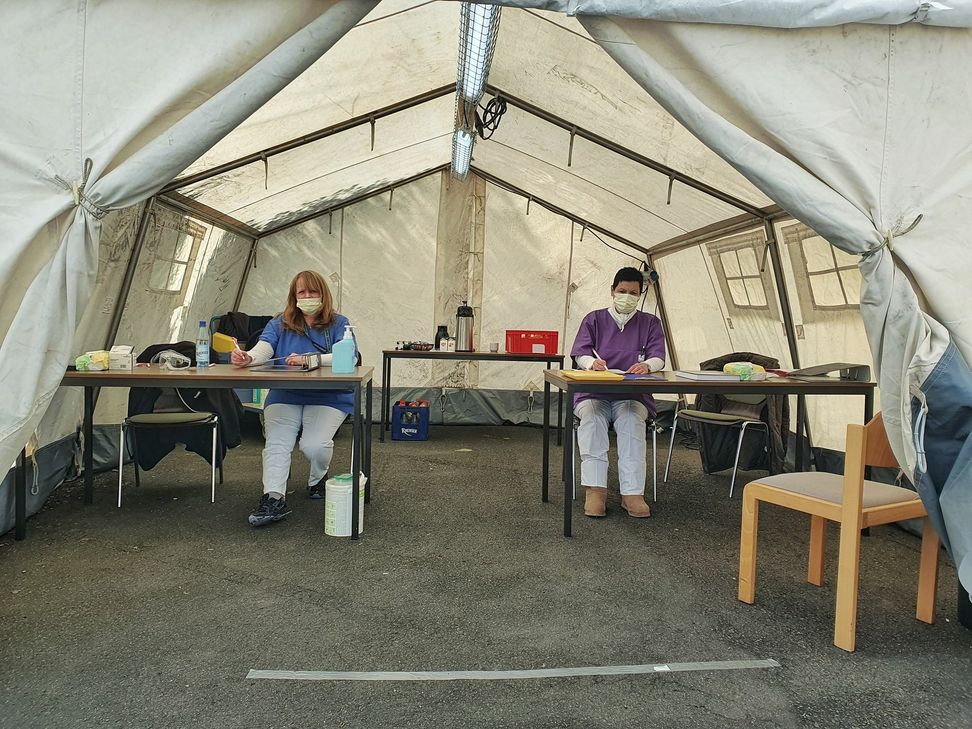 Am Wochenende unterstütze die Feuerwehr das Krankenhaus beim Aufbau zweier Zelte im Innenhof. Am Montagmorgen um 8 Uhr wurde mit dem Dienst in der Voruntersuchung begonnen. Die Krankenschwestern Birgitt Brusius-Klein und Kerstin Georg hatten, unterstützt durch einen Arzt, die Premierenschicht übernommen. Trotz einer kleinen Zeltheizung, war dies bei minus 4 Grad ein kühles Unterfangen. Die beiden hatten aber bis zur Mittagszeit nur beratende Gespräche mit Kollegen. Alle neuen Patienten, egal welcher Symptome, ob Husten oder Schnittverletzungen, müssen nun zuerst in das Zelt zur Voruntersuchung. Dieses ist von 8 bis 22 Uhr besetzt, so soll das Krankenhaus mit Patienten und Personal noch besser geschützt werden. Wenn Patienten ihren Hausarzt nicht erreichen können und Symptome einer Grippe oder dem Corona-Virus haben, können sie sich auch an dieser Voruntersuchung-Station melden.