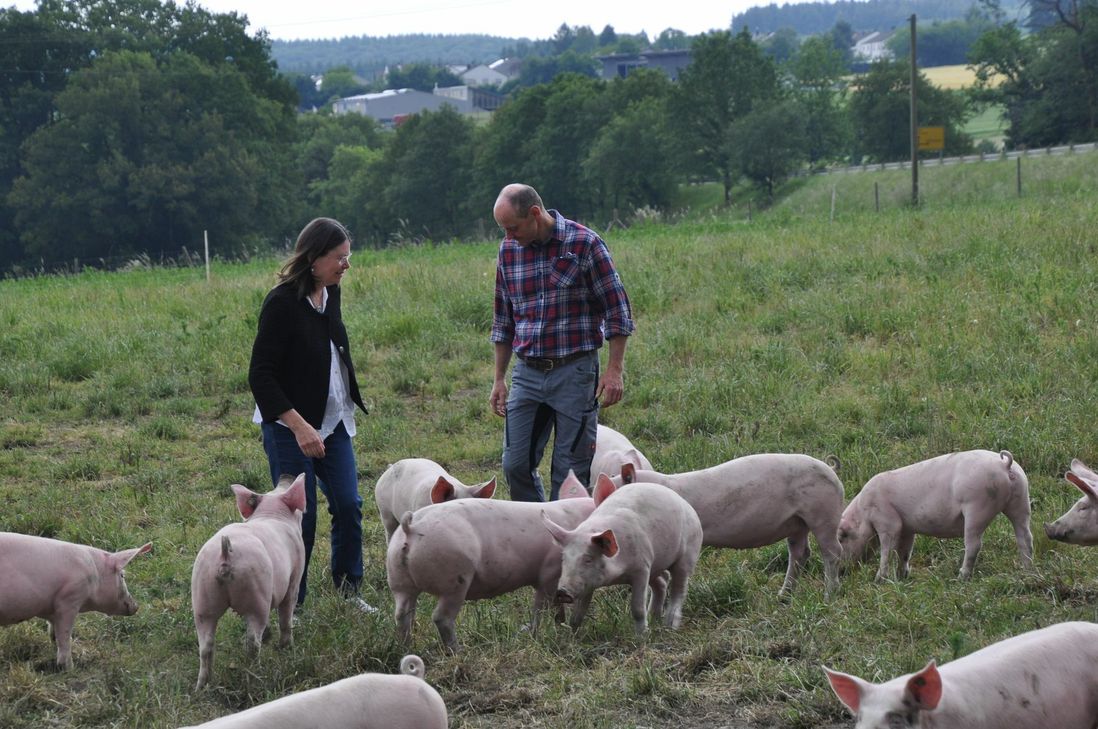 Unter Beachtung der gebotenen Abstands- und Hygienevorschriften, stand zunächst der Besuch der Weitersbacher Mühle in der Nähe von Rhaunen auf dem Programm. Hier bewirtschaftet Familie Lorenz landwirtschaftliche Flächen zum Getreideanbau. Das Getreide wird in der hofeigenen Mühle vermahlen und das so gewonnene Mehl ist sowohl im eigenen Mühlenladen, wie auch im regionalen Einzelhandel erhältlich. Für Familie Lorenz hat sich die konsequente Ausrichtung auf Qualität und transparente Regionalität in Verbindung mit "SooNahe" sehr deutlich bei der erfolgreichen Vermarktung ihrer Produkte ausgewirkt und nicht zuletzt auch einen wichtigen wirtschaftlichen Beitrag geleistet. So wurde im Frühjahr ein sehr ansprechender Neubau des Mühlenladens eröffnet, der von den Kunden gut angenommen wird. Auch das Problem Tierwohl am Beispiel der Schweinehaltung wurde inmitten der freilaufenden Schweine der Familie Lorenz thematisiert.