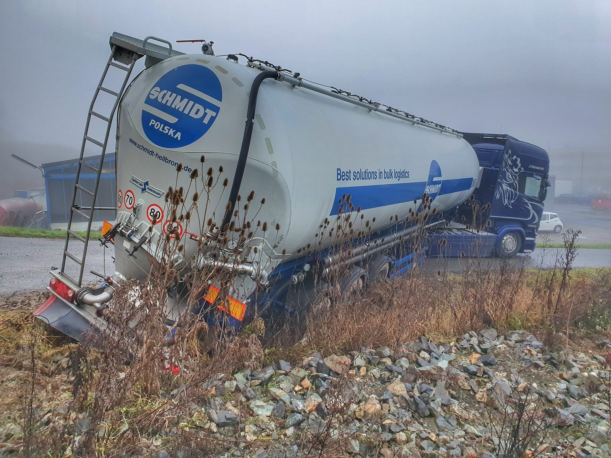 Der Fahrer des Lastzugs wollte nach eigenen Angaben gegen 6 Uhr von der B 41 in den Industriepark Allweiden fahren, um dort zu wenden. Auf der steilen, teiweise unbefestigten Straße zwischen Truck Center Krämer und der KFZ-Prüfstelle kam sein Auflieger mit 25 Tonnen Kunststoff Granulat in den Straßengraben. Der Lastzug stellte sich so schief, dass das linke vordere Rad der Zugmaschine etwa 50 Zentimter vom Boden abhob. Die Bergungsarbeiten haben gegen 10 Uhr begonnen.