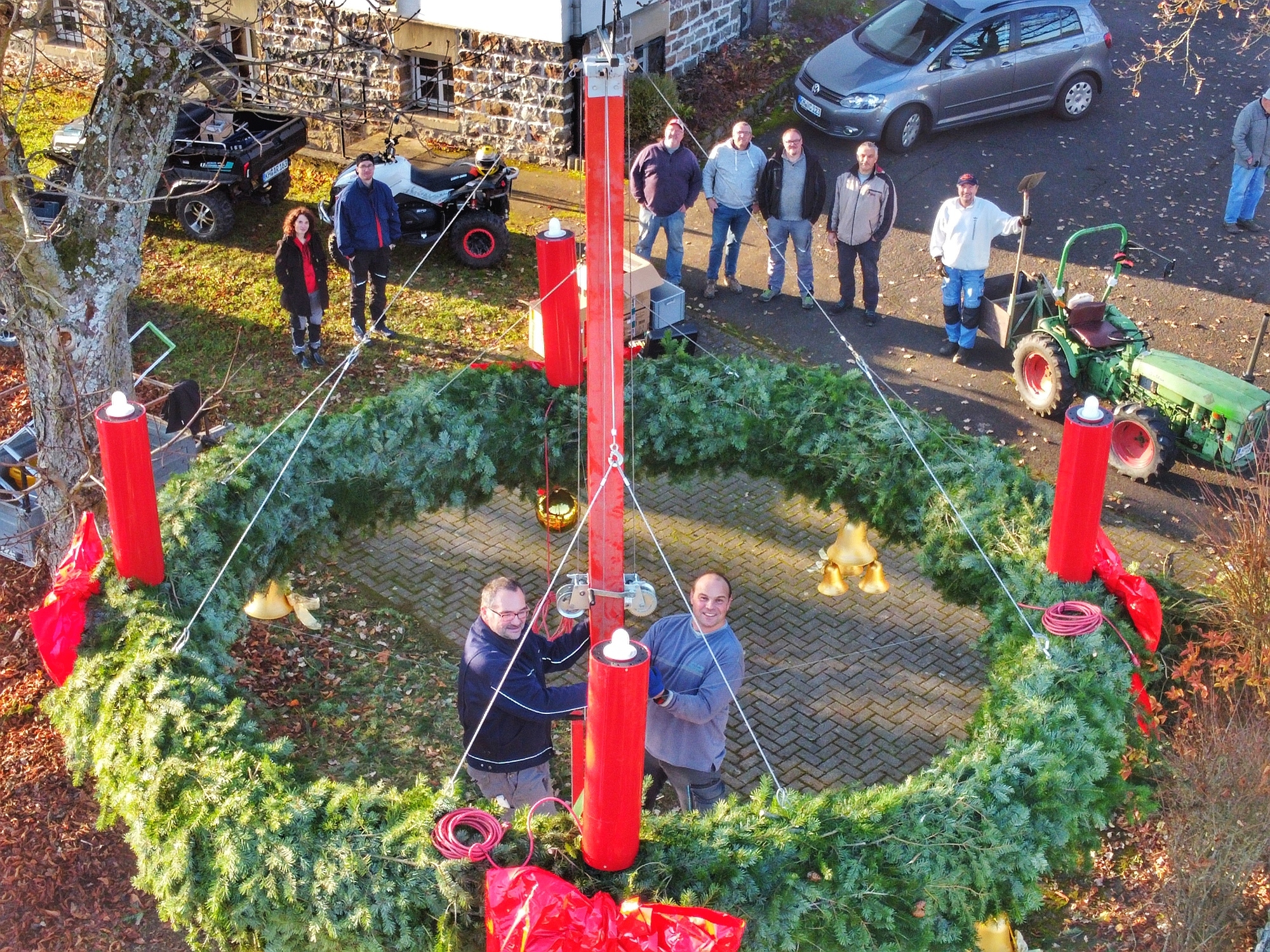 Zuerst wurde der sechs Meter hohe Mittelpfosten fixiert, dann ging's an den Zusammenbau des Kranzes. Mit viel Kraft und Geschick verbanden die Helfer die zwei Zoll großen Verschraubungen passgenau, anschließend wurden die Kerzen montiert. Tags darauf flochten die Helfer die vielen Tannenzweige zu einem großen Kranz. "Wir wollten für ein bisschen Adventsstimmung im Ort sorgen, da ja unser Weihnachtsmarkt leider wieder ausfallen muss", so Alfred Wendling, erster Vorsitzender des Vereins Young Humps, der die Advents-Aktion initiiert hatte.