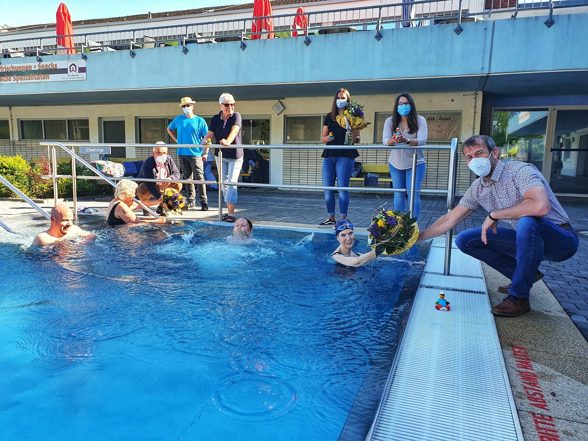 Bürgermeister Thomas Jung eröffnete die Saison 2021 offiziell und überreichte den ersten drei Damen je einen Blumenstrauß. Am Mittwochmorgen war das Team der Stadtwerke um Jürgen Kehl, Andreas Kaiser, Lisa Schneider sowie Nina Hempel frühzeitig vor Ort, um den beiden Bademeistern Kersten Becker und Arthur Domke beim Coronastart gegebenenfalls unter die Arme zu greifen. Der Oberhauser Daniel Scholz und sein Sohn Leon lobten das Onlinebuchungssystem, das Online bezahlen und der kontaktlose Eintritt mit dem QR Code funktionierte reibungslos. Selbstverständlich ist das Kassenhäuschen auch weiter besetzt, so dass jederzeit kompetente Hilfe und auch ein Notfallticket am Eingang erworben werden kann. Das Buchungssystem erreicht man über www.kirner-land.de. Höchstens 300 Menschen dürfen gleichzeitig pro Zeitslot aufs Gelände. Auch in diesem Jahr geht freilich nichts ohne Termin. Die Zeiten täglich von 9 bis 12.45 Uhr, und von 15 bis 18.45 Uhr. Leider bleibt die recht lange Pause vorerst von 12.45 bis 15.00 Uhr, die zum Reinigen und Desinfizieren des Geländes dient, in der besten Badezeit bestehen. Neu ist donnerstags ein Frühschwimmen von 7 bis 8.30 Uhr, das es zum Preis von 2,50 Euro gibt. Die anderen Badeblöcke kosten je 3 Euro für Erwachsene, 2 für Jugendliche von elf bis 18 Jahren und Kinder unter elf Jahren kostenlos.