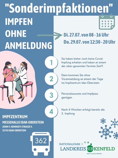 Der Landkreis Birkenfeld bietet am Dienstag und Donnertstag, 27. und 29. Juli, zwei Sonderimpfaktionen im Impfzentrum in der Idar-Obersteiner Messehalle an.
