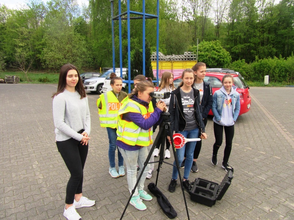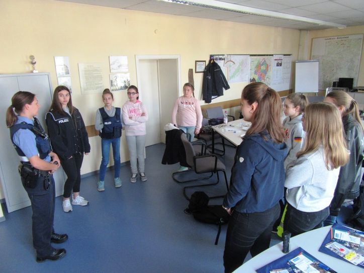 Polizeioberkommissar Volker Eifler empfing die Schülerinnen am Morgen, um ihnen anschließend das Berufsbild der Polizeibeamtin näher zu bringen und gewährte einen Blick hinter die Kulissen der Behörde. Dienststellenleiter EPHK Ermel und sein Stellvertreter KHK Greschke ließen es sich dabei nicht nehmen, die „Ordnungshüterinnen auf Zeit“ an ihrem Tag auf der Wache zu begrüßen. Viel Abwechslung beim Polizei-Job Nach einer Vorstellungsrunde zeigten zum Einstieg mehrere Informationsfilme, wie breit gefächert, abwechslungs- und spartenreichen sich das Berufsbild des Polizeibeamten darstellt. Den Mädchen wurde der Arbeitsalltag der Schutz-, Kriminal- und früheren Bereitschaftspolizei vorgestellt sowie das Aufgabenspektrum von Wasserschutzpolizei, Spezialeinheiten, Hubschrauberstaffel, Diensthundestaffel und LKA erläutert. Insbesondere wurden auch die Ausbildungsinhalte vorgestellt, die angehende Polizeibeamte in ihrem dreijährigen Studium an der Hochschule der Polizei beim Flugplatz Hahn erwarten. Polizeihauptkommissar Knorr führte danach eine erkennungsdienstliche Behandlung mit einem der Mädchen durch, demonstrierte die Abnahme von Fingerabdrücken und fertigte Fotos der Probandin für die „Verbrecherkartei“. Die 23-jährige Polizeikommissarin Fenja Haag erzählte den Schülerinnen anschließend von ihren bisherigen Berufserfahrungen aus der Sicht einer jungen Frau, die sich im oft harten Berufsalltag auch mal mit schweren Jungs befassen muss. Auch mal "schwere Jungs" dabei Als den Jugendlichen im Anschluss ermöglicht wurde, die vielfältigen Uniform- und Ausrüstungsteile probezutragen, kam somit auch der Spaßfaktor nicht zu kurz. Dabei standen sich die jungen Damen sogar mit Schutzhelm und Demo-Schild gegenüber. Neben der persönlichen Ausstattung eines jeden Polizeibeamten wurden auch die Waffen und Einsatzmittel vorgestellt, was mit großem Interesse verfolgt wurde. Die Funktionsweise von Atemalkoholmessgerät und Drogentest wurde anschließend anschaulich vorgeführt. Begeistert wurde in diesem Zusammenhang insbesondere die „Rauschbrille“ getestet, die entsprechende visuelle Veränderungen bei der Wahrnehmung verursacht und entsprechend lustige Kuriositäten hervorbrachte. Wie sich das Arbeitsgeschehen auf der Wache einer Polizeiinspektion darstellt, wurde bei einem Rundgang durch das Dienststellengebäude erläutert. Hierbei machten die jungen Damen auch die Erfahrung, dass der Aufenthalt in einer abgeschlossenen Gewahrsamszelle doch recht ungemütlich und beklemmend sein kann. Mit Blaulicht und Martinshorn Blaulicht, Martinshorn und endlich einmal selbst im Polizeieinsatzfahrzeug sitzen dürfen, wurde den Schülerinnen danach im Hof der Polizeiinspektion ermöglicht. Wenig später ging es dann zum "echten" Polizeidienst auf die Straße, wo sich erfahrungsgemäß der Großteil der Arbeit bei der Schutzpolizei abspielt. Ohne Scheu führten die jungen Damen – mit Anhaltekelle und Warnweste ausgestattet – selbst Verkehrskontrollen mit ankommenden Fahrzeugen durch. Dabei staunten die Autofahrer nicht schlecht, als sie von Schülerinnen angehalten und nach Führerschein und Fahrzeugschein gefragt wurden. Erfreulicherweise spielten alle kontrollierten Autofahrer bei dieser ungewöhnlichen Kontrolle mit und fügten sich den "polizeilichen" Weisungen der jungen Ordnungshüterinnen. Nach einer kurzen Einweisung durften die Mädchen sogar eigenhändig Geschwindigkeitskontrollen mit dem Lasermessgerät durchführen und stellten sich dabei recht geschickt an. Eine Autofahrerin, die die Geschwindigkeit dabei auch tatsächlich überschritten hatte, kam zu ihrer Erleichterung mit einer mündlichen Verwarnung davon. Nach einem unterhaltsamen und informativen Tag bei der Polizeiinspektion Birkenfeld lud POK Eifler seine acht jungen „Kolleginnen“ noch ins Eiscafé ein, wo es bei der Abschlussbesprechung durchweg positive Rückmeldungen gab. Das große Interesse und die ungezwungenen Offenheit der Schülerinnen erfreuten auch den Polizeibeamten, denn durch die tolle Mitarbeit einer derart homogenen Gruppe stellt ein Informationstag dieser Art auch eine willkommene Abwechslung zum Arbeitsalltag dar. Deswegen wird es den „Girlsday“ bei der Polizei Birkenfeld höchstwahrscheinlich auch in den nächsten Jahren geben.