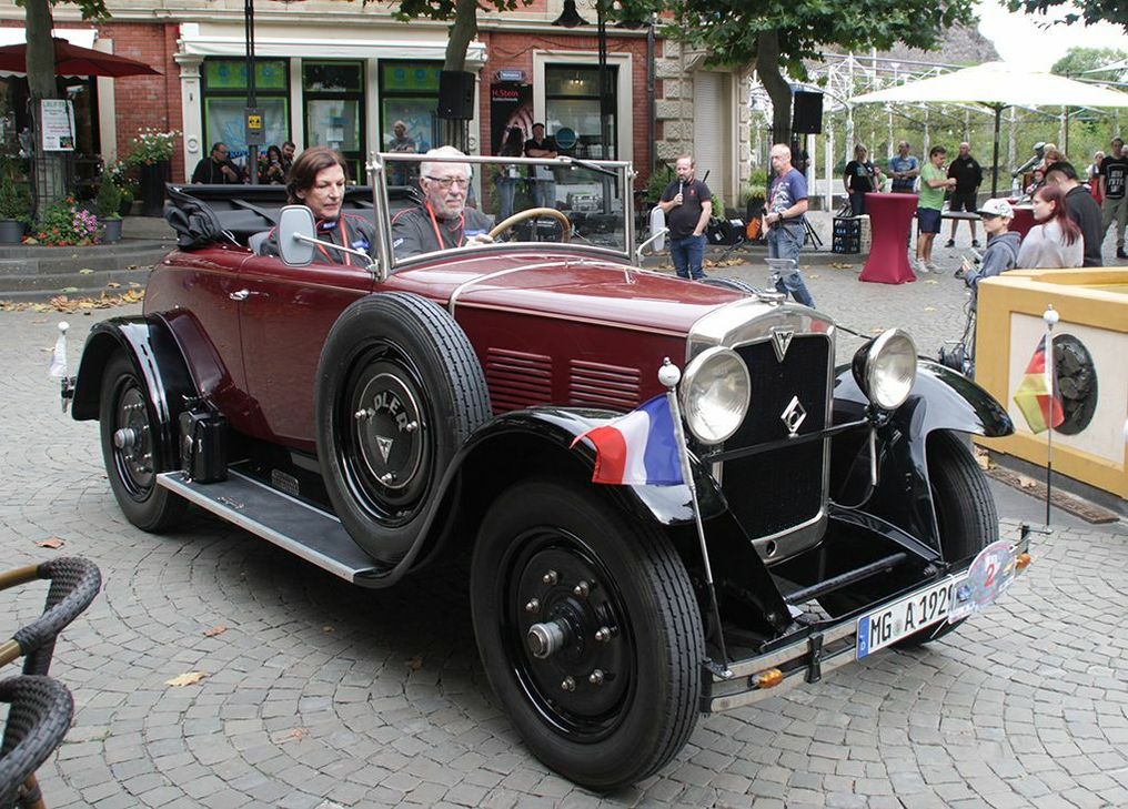 Nach einem ausgiebigen Frühstück und anschließenden Briefing im Idarer Brauhaus ging es zum Start am Schleiferplatz. Während die Fahrzeuge anmoderiert wurden, gab es noch ein Erinnerungsfoto vom Oldtimer mit der Besatzung, das später im Ziel ausgehändigt wurde. Bei einer Zwischenstation beim Köhlerfest in Langweiler erhielten die Teams ein Autogramm von Edelsteinkönigin Bettina Reiter. Nach weiteren Streckenabschnitten entlang der Deutschen Edelsteinstraße und dem Geschicklichkeitsparcours der Mitglieder des Sportfahrerteams Hunsrück (STH) auf dem Festplatz in der Vollmersbachstraße, kamen gegen 15.30 Uhr die ersten Oldtimer am Ziel, dem Obersteiner Marktplatz, an. Wie immer wurde der Zieleinlauf der Fahrzeuge moderiert von Leonhard Stibitz, der die zahlreichen Zuschauer mit seinem enormen Fachwissen über die Oldtimer informierte und Rouven Voigt, der kurze Interviews mit den Fahrern führte. Das älteste Fahrzeug war ein Adler Standard 6 aus dem Jahr 1929. Das war auch das Geburtsjahr des Piloten Siegbert Zimmer, der trotz seiner 90 Lenze das Automobil auch ohne Servolenkung oder anderen neumodischen Schnickschnack sicher über die heimischen Landstraßen pilotierte. Das Wegberger Fahrerteam, verstärkt durch Mechtild Gössling, war gekleidet im klassischen Adler-Service Overall. Der Grund für die lange Anreise, war die Herkunft des Automobils. Es wurde 1929 in Idar-Oberstein auf den Edelsteinhändler Max Crummenauer zugelassen und überstand mit mehr oder weniger starken Blessuren die Wirren des zweiten Weltkrieges und darüber hinaus, bis es der Fahrer 1997 erwarb, bis 2011 restaurierte und nun zum 90 Geburtstag wieder in seine Heimatstadt brachte. Der Adler Standart wurde von den Zuschauern mit dem Prädikat „schönster Oldtimer“ belohnt vor dem nicht weniger beeindruckenden Chevrolet Series 62 von Jens Jakubczyk. Das mächtige Coupé stammt aus dem Jahr 1958 und verfügt über gigantische Heckflossen, die an das Leitwerk eines Kampfflugzeuges erinnern sollten. Seine Kraft schöpft der Wagen aus einem fulminanten V8 Motor mit sechs Liter Hubraum. Ganz anderes der Daihatsu Midget (Zwerg), ein sogenanntes Kei-Car aus Japan. Mit diesem Mini Pickup braucht man keinen sonst in Japan üblichen und teuren Parkplatznachweis. Der Midget, obwohl noch kein Oldtimer war ebenso ein Hingucker wie der Ford Crown Victoria Police Interceptor, der in vollem Polizei-Ornat des Citrus Heights Police Departments vorfuhr, so wie er tatsächlich von 2011 bis 2018 in Kalifornien Dienst tat. Die meisten Punkte und damit den ersten Platz erreichten Jürgen und Agnes Altvater auf ihrem Renault Fuego vor Rolf und Gerlinde Korell im Opel Rekord CarAvan und Stefan und Philipp Kimmling auf einem Mercedes 280 S.