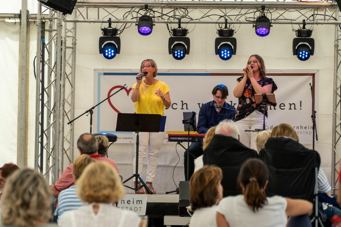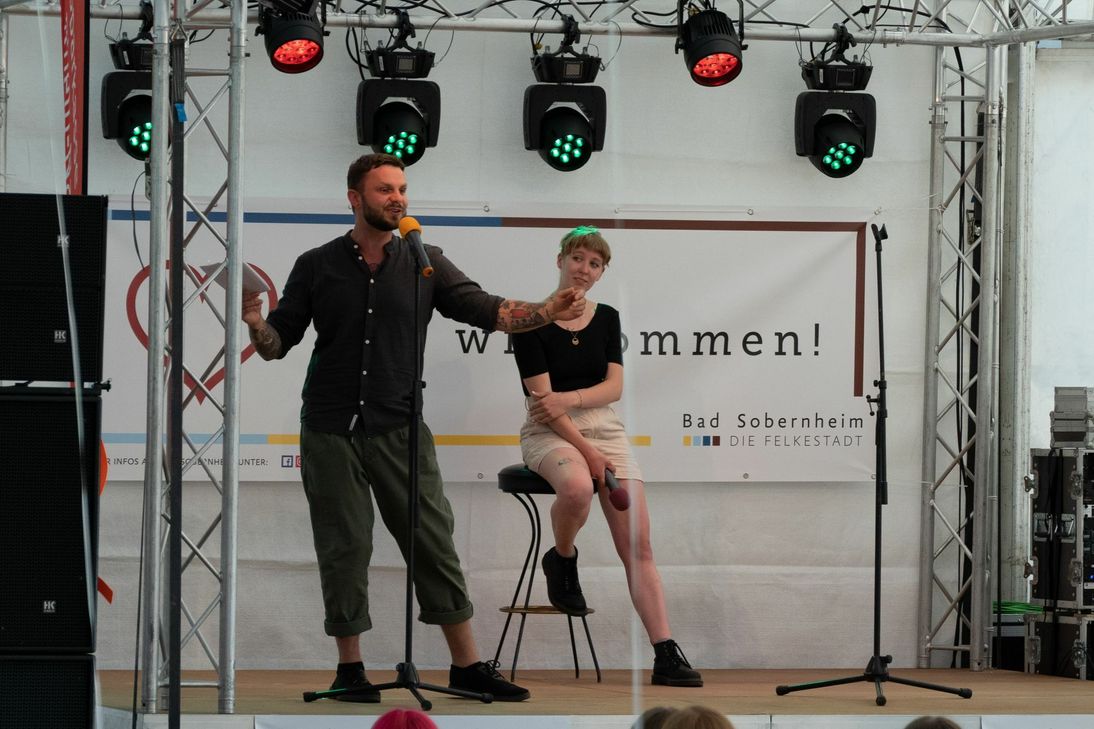 Einzig das Wetter hat nicht so ganz mitspielen wollen – aber dank des TV-Bad Sobernheim konnte sich das Veranstaltungsteam um Ully Mathias auf eine passende Lösung in Form des Festzeltes an der TV-Halle verlassen. So lauschten unter dem Zeltdach auf gemütlichen Decken die knapp 100 Besucher am Samstagabend den Worten der beiden Poetry Slammer. Florian Stein aus Bochum und Leonie Batke aus Mainz mussten sich dabei ausnahmsweise aber nicht dem üblichen Worte-Wettstreit stellen. Sie durften vielmehr ihre Texte und Gedanken zu Szenen des Alltags oftmals mit einem Funken Humor und Selbstironie gemischt dem Bad Sobernheimer Publikum präsentieren. "Nach wirklich langer Zeit endlich wieder live vor Publikum auftreten dürfen fühlt sich prima an und Bad Sobernheim hat dies möglich gemacht", äußerten beide Künstler zum Abschluss des Abends einstimmig. Nach einem gelungenen Auftakt am Samstagabend ging es in Bad Sobernheim am Sonntagvormittag direkt mit der zweiten "Uff de Deck"-Veranstaltung weiter. Die Online-Tickets zur musikalischen Lesung mit ABBA – The Story waren bereits Tage zuvor ausverkauft. Auch dieses Kulturangebot der Felkestadt brachte über 100 Gäste auf den Decken (und teilweise auch Stühlen) in Stimmung. Schon direkt zu Beginn als Silke Vorrath mit Ully Mathias "Waterloo" singend die Bühne im Zelt betraten, wurde der ABBA-Hit im Takt mitgeklatscht und man spürte auch hier nochmal allen Beteiligten die Freude am ersten gemeinsamen Erlebnis nach langer Zeit an. Die perfekte Begleitung am Piano bot dabei Alex Mathias.