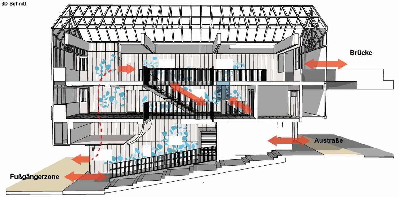 Die zukünftige Nahepassage ist für Fußgänger bei der Überquerung der Naheüberbauung von besonderer Bedeutung und durch die Sperrung müssen leider kurze Umwege in Kauf genommen werden. Zurzeit wird das Edelstahlgeländer gefertigt und der Einbau erfolgt ab Mitte Juli. Bis dahin sind die abgehängten Decken eingebaut, und auch mit der Elektroinstallation kann begonnen werden. Der Durchgang zwischen Austraße und Fußgängerzone wird nach der Fertigstellung mit einer bequem zu gehenden Treppe und einer Rampe für Rollstuhlfahrer ausgestattet sein. Darüber hinaus wird dort ein Behinderten WC installiert und es werden Informationstafeln wissenswerte Details über die Naheüberbauung zeigen.