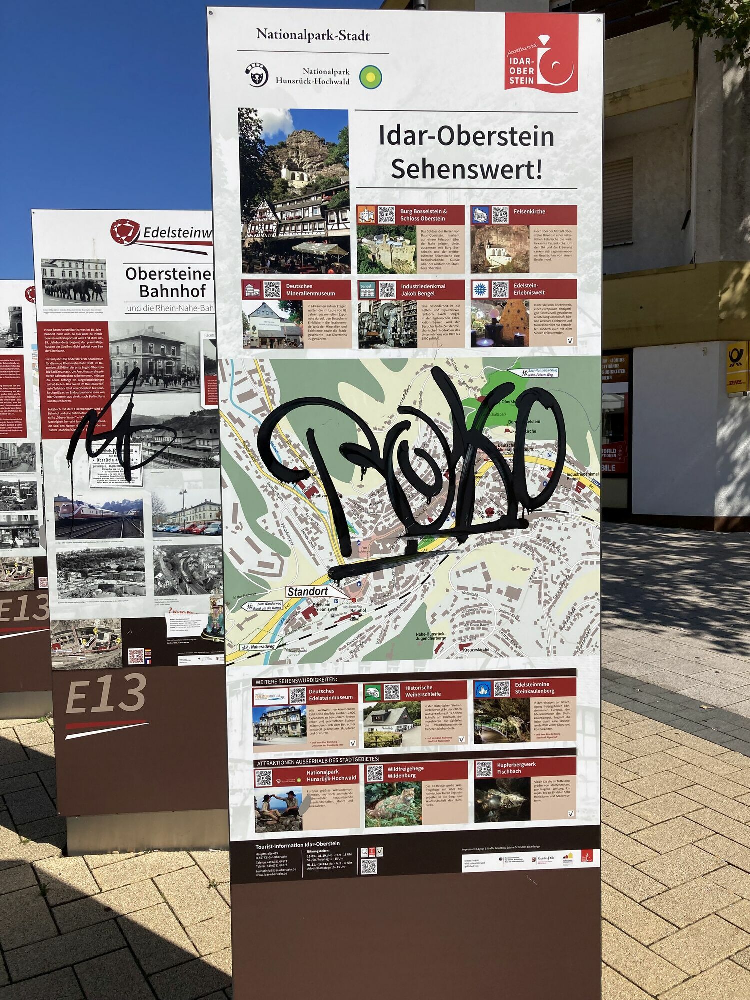 So wurde seit Anfang dieser Wochen in der Mainzer Straße das Verkehrszeichen besprüht und abgeändert. Bereits vorher wurden in diesem Bereich mittlerweile drei Verkehrszeichen gestohlen. Darüber hinaus wurden jetzt gegenüber dem Bahnhof, im Bereich des früheren C&A Graffitischmierereien festgestellt. Allein der Schaden an den Stelen liegt zwischen 800 und 1800 Euro. Das richtet sich danach, ob eine Reinigung möglich sein wird oder die Stelen erneuert werden müssen. Die Delikte werden zur Anzeige gebracht. Wer Hinweise zum Hergang der Taten oder den Verursachern geben kann wird gebeten, sich unter Telefon 06781/64-672 mit dem städtischen Tiefbauamt oder unter Telefon 06781/561-0 mit der Polizeiinspektion Idar-Oberstein in Verbindung zu setzen.