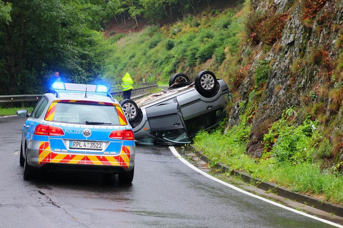 In der scharfen Rechtskurve geriet das Fahrzeug von der Fahrbahn ab, schleuderte in die Felswand und zurück auf die Straße. Es blieb auf dem Dach liegen, zum Glück wurde der Fahrer nicht verletzt. Ersthelfer sicherten die Unfallstelle bis zum Eintreffen der Polizei ab, diese regelte etwa 45 Minuten den Verkehr. Das Auto wurde stark beschädigt, war nicht mehr fahrbereit und musste abgeschleppt werden. Weiterer Unfall Nur 2 900 Meter entfernt, ebenfalls auf der L 182, ereignete sich zeitgleich ein weiterer Unfall. Hier fuhr ein Kirner mit seinem Golf von Rhaunen in Richtung Hahnenbach. Etwa 150 Meter vor der Abfahrt Sonnschied wich er nach eigenen Angaben einem Reh aus. Dabei verlor er ebenfalls die Kontrolle über sein Fahrzeug, schleuderte mit seinem Golf über die Gegenfahrbahn und blieb auf der Seite an der Felswand liegen. Auch er konnte sich selbst aus dem Fahrzeug befreien, Passanten halfen dem Mann das Fahrzeug wieder auf die Räder zu stellen. Der Golf musste ebenfalls abgeschleppt werden. Kurz vor den Unfällen gab es einen Gewitterschauer und die Straße war nass. Foto: Schmitt