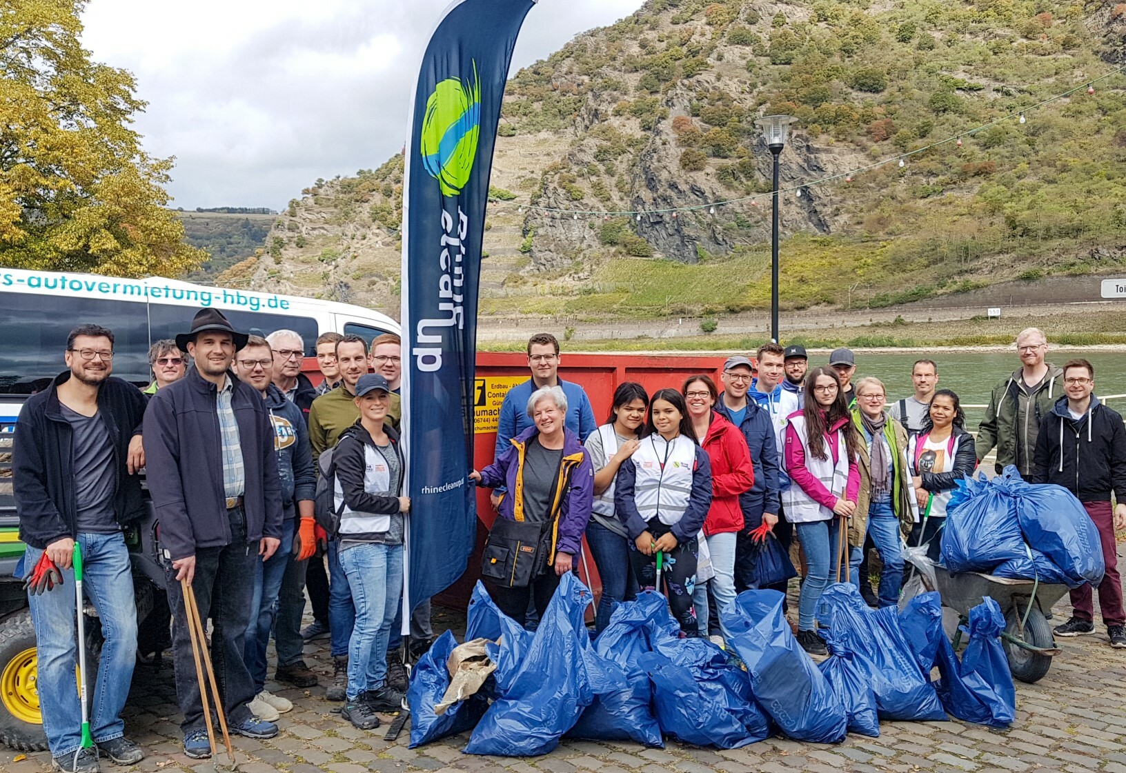 Der UNESCO-Schulkoordinator, Holger Weißmann, erfreute sich darüber, dass der Müll an vielen Stellen nur schwer zu finden war: „Wir haben am Rheinufer weniger Müll gefunden als erwartet. Die Oberweseler scheinen ihre Stadt sauber zu halten!“ Ausgestattet wurden die Helfer mit Mülltüten, Handschuhen, Greifern und Warnwesten, die von den Sparkassen, der Fisch-Gastro-Kette Nordsee und der RhineCleanUp Initiative gesponsert wurden. Bestens ausgerüstet konnten die ehrenamtlichen Helfer auf dem knapp 5 km langen Abschnitt rund acht Kubikmeter Abfall und Unrat sammeln, der von der Rhein-Hunsrück-Entsorgung fachgerecht entsorgt wurde. Unter dem gesammelten Müll fanden sich auch Kuriositäten wie alte Fahrräder, Einkaufswagen, Reifen und zahlreiche Flaschenpost. Für die Koordination des RhineCleanUps in der Region zeigte sich der Zweckverband Welterbe Oberes Mittelrheintal verantwortlich, der das RhineCleanUp auch im nächsten Jahr tatkräftig unterstützen möchte. Neben dem Rheinufer und den Rheinanlagen wurde auch der Bereich des Bahndammes, die „Seufzerallee“, das Michelfeld, der Stadtgarten und einige Weinbergswege gesäubert. Gegen Ende der Aktion konnte mithilfe eines Oberweseler Sand- und Kieshändlers mit schwerem Gerät die Hafensohle von Abfällen befreit werden. Zum Abschluss lud die Stadt Oberwesel alle Helferinnen und Helfer zum gemeinsamen Mittagessen ein.