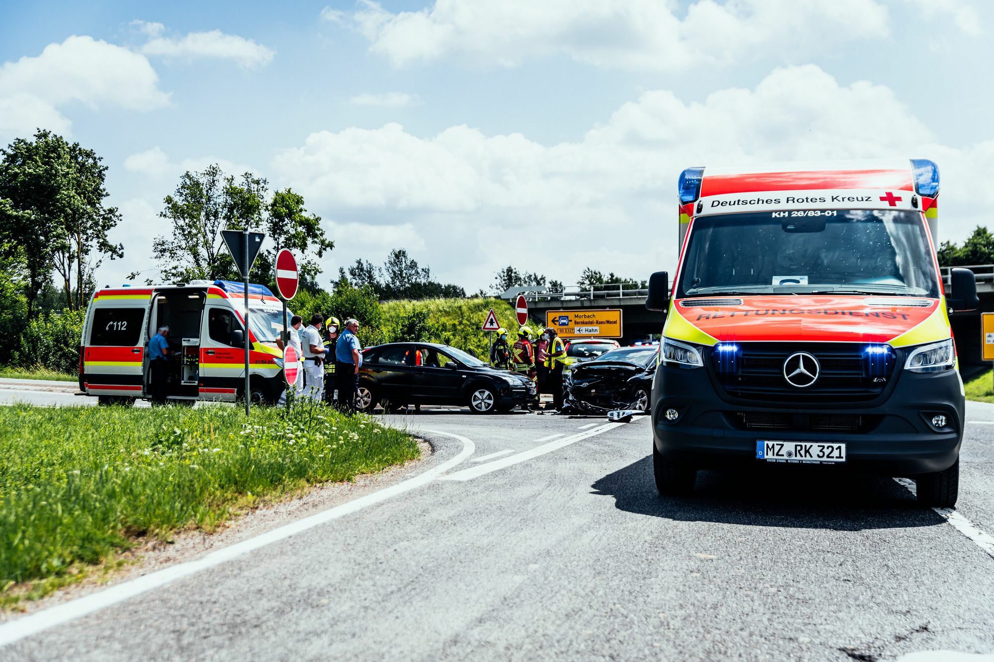 Erster Unfall: Durch das Missachten der Vorfahrtsregelung kam es zum Zusammenstoß zweier Fahrzeuge, ein drittes Fahrzeug wurde nur leicht beschädigt. Insgesamt wurden bei dem Unfall fünf Personen verletzt, zwei davon leicht. Im weiteren Verlauf befreiten die Einsatzkräfte noch einen Hund aus einem der Unfallfahrzeuge, klemmten die Batterien der Fahrzeuge ab, nahmen auslaufende Betriebsstoffe auf und richteten zu allen Seiten eine Vollsperrung ein.
