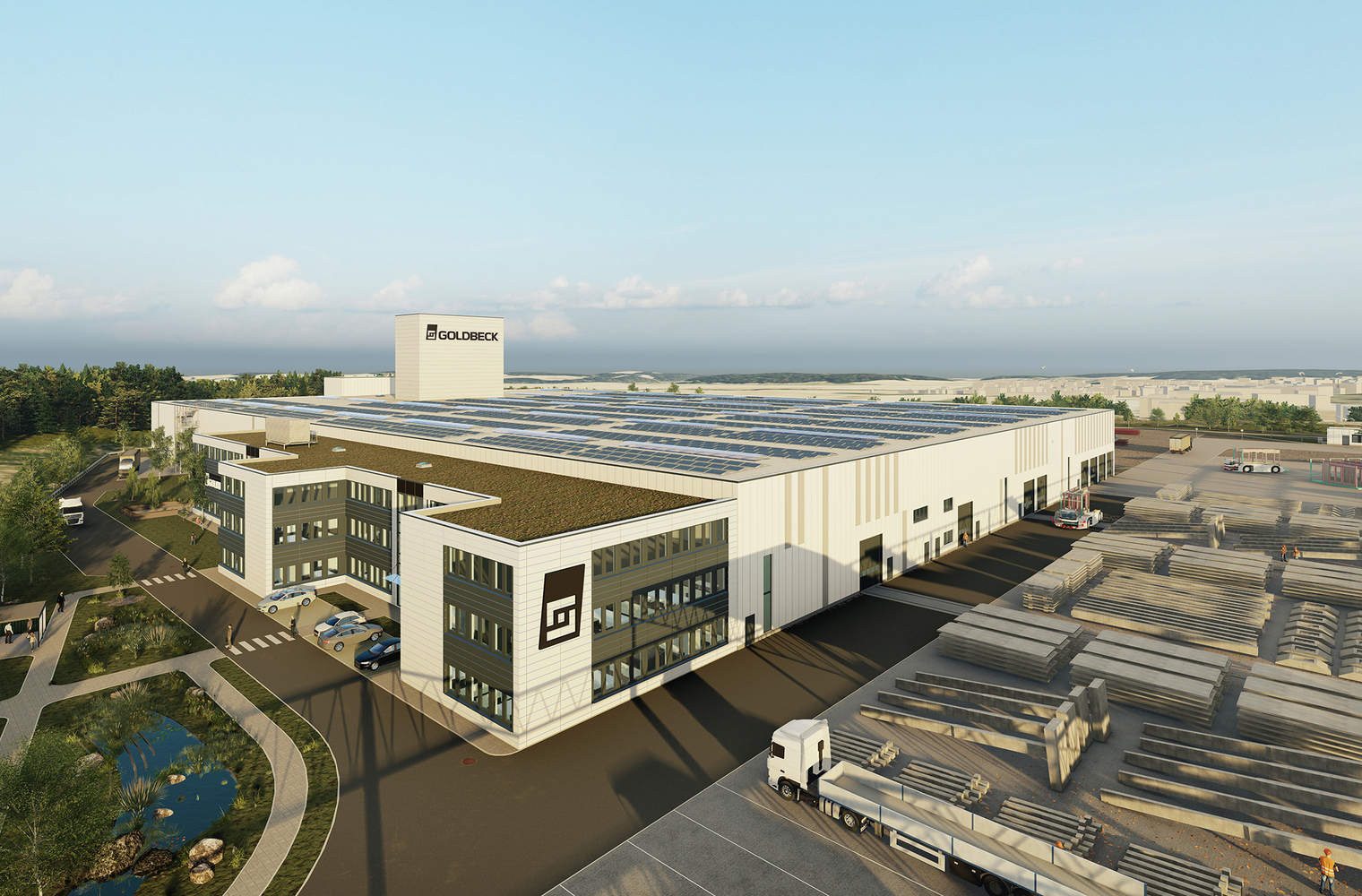 Auf einer Fläche von 20 000 Quadratmetern wird Goldbeck ab 2025 Stützen, Decken, Parkhausplatten und Wandelemente herstellen, die das Unternehmen anschließend mit weiteren Systemelementen zu schlüsselfertigen Immobilien wie Produktions- und Logistikhallen sowie Büro-, Schul- oder Wohngebäuden montiert.