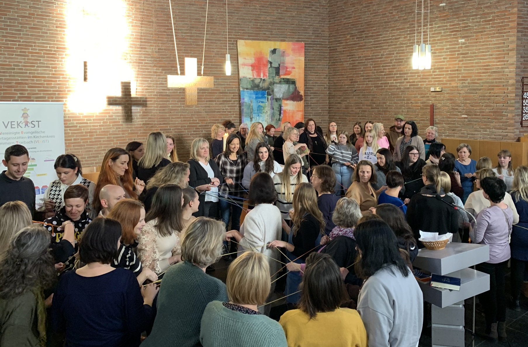 In einem gemeinsamen Gottesdienst, der in den Tag einstimmte, betrachtete Knut Ebersbach die Gemeinsamkeit und Vernetzung der Kitas und durch das gemeinsame Singen entstand in der stimmungsvoll geschmückten Kirche ein Gefühl des Getragenseins und der Zusammengehörigkeit. Die musikalische Begleitung übernahmen die Erzieherin Daniela Mader, Fachberaterin Simone Berg (beide Klarinette) und am Klavier die Organistin Tatjana Gebel. Während des Gottesdienstes konnten alle auf Karten Wünsche notieren, was sie sich für die Zukunft von VEKiST erhoffen. Einige Zettel wurden exemplarisch in der Kirche vorgelesen. Worte wie, Vertrauen, gemeinsam an der Weiterentwicklung mitwirken, Respekt, feste Arbeitsverträge für alle waren zu hören. Die Karten wurden gesammelt und weden ausgewertet.