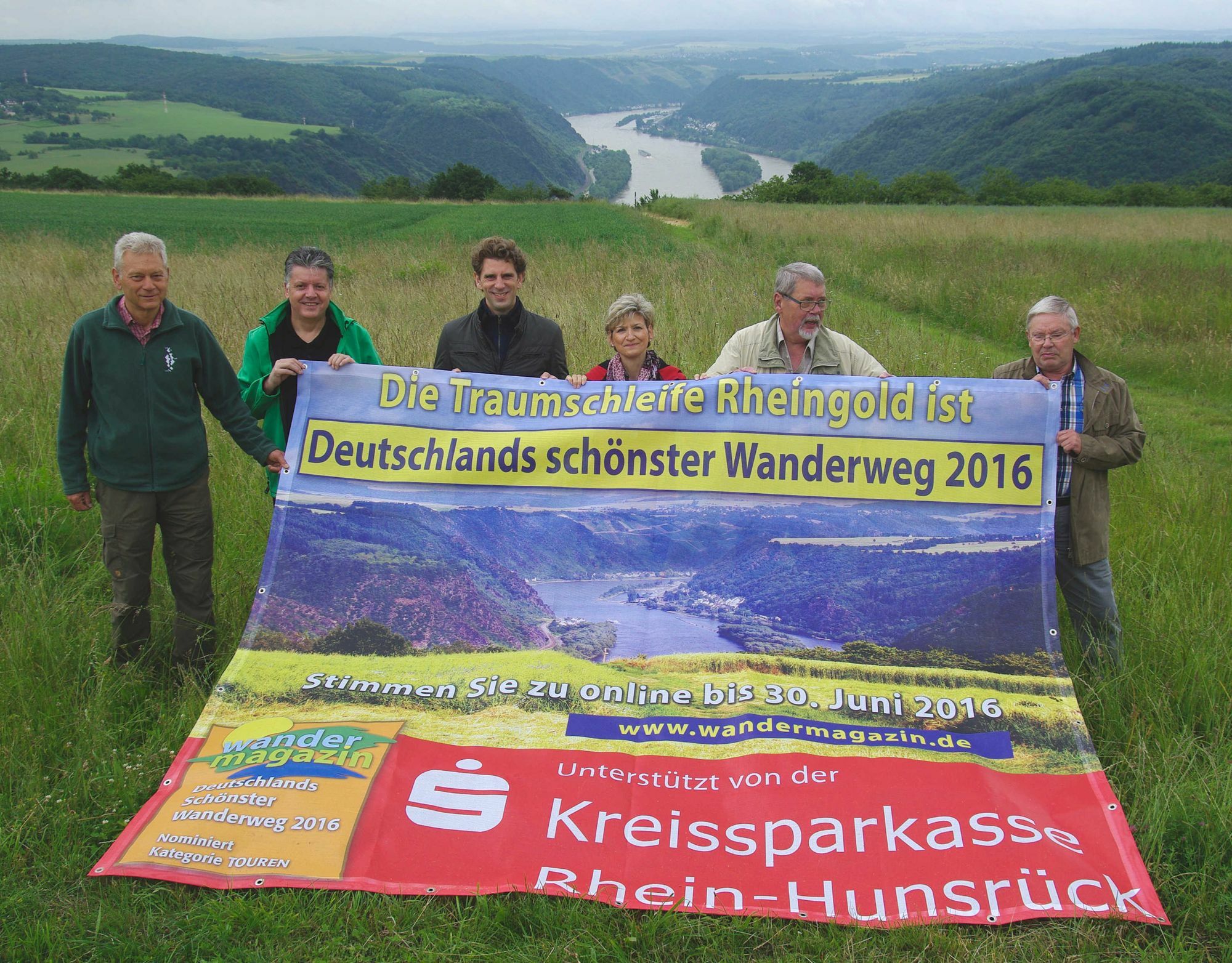 von Arno Boes 10,6 km lang ist die Bopparder Traumschleife „Rheingold“, ein Wanderweg, der vor allem mit tollem Panorama über das Mittelrheintal lockt. Von der Zeitschrift „Wandermagazin“ wurde die Schleife jetzt für die Rubrik „Touren“ für die Wahl zum schönsten Wanderweg 2016 nominiert. „Rheingold“ ist der einzige Weg aus Rheinland-Pfalz, der in die Wertung kam und deshalb möchte man natürlich auch aus überregionaler Sicht möglichst weit vorne landen. In der vorigen Woche hatte man noch den Spitzenplatz, aber die „Mainzer Köpfe“ aus dem hessischen Werra-Meißner-Tal sowie Wege aus NRW und Schwaben hatten im Vergleich zu den Vorwochen mächtig aufgeholt. Grund genug für Landrat Dr. Marlon Bröhr und Bürgermeister Dr. Walter Bersch nochmal gemeinsam mit weiteren Partnern der Aktion die Werbetrommel zu rühren. Am „Edgar-Reitz-Blick“ wurde das Transparent ausgebreitet, das auch an vielen anderen Stellen in der Region zu finden ist. Noch bis zum 30. Juni 2016 kann man seine Stimme auf www.wandermagazin.de abgeben und die Region um Boppard sowie der Rhein-Hunsrück-Kreis hoffen natürlich, mit dem Prädikat „Deutschland schönster Wanderweg 2016“ den Tourismus zukünftig weiter ankurbeln zu können.