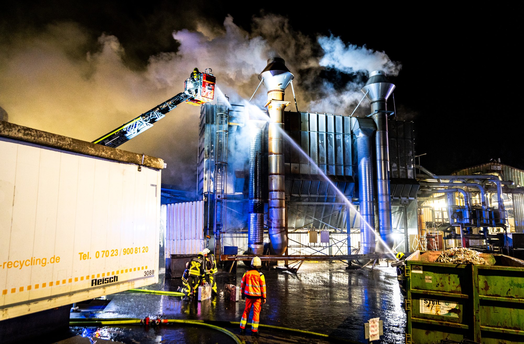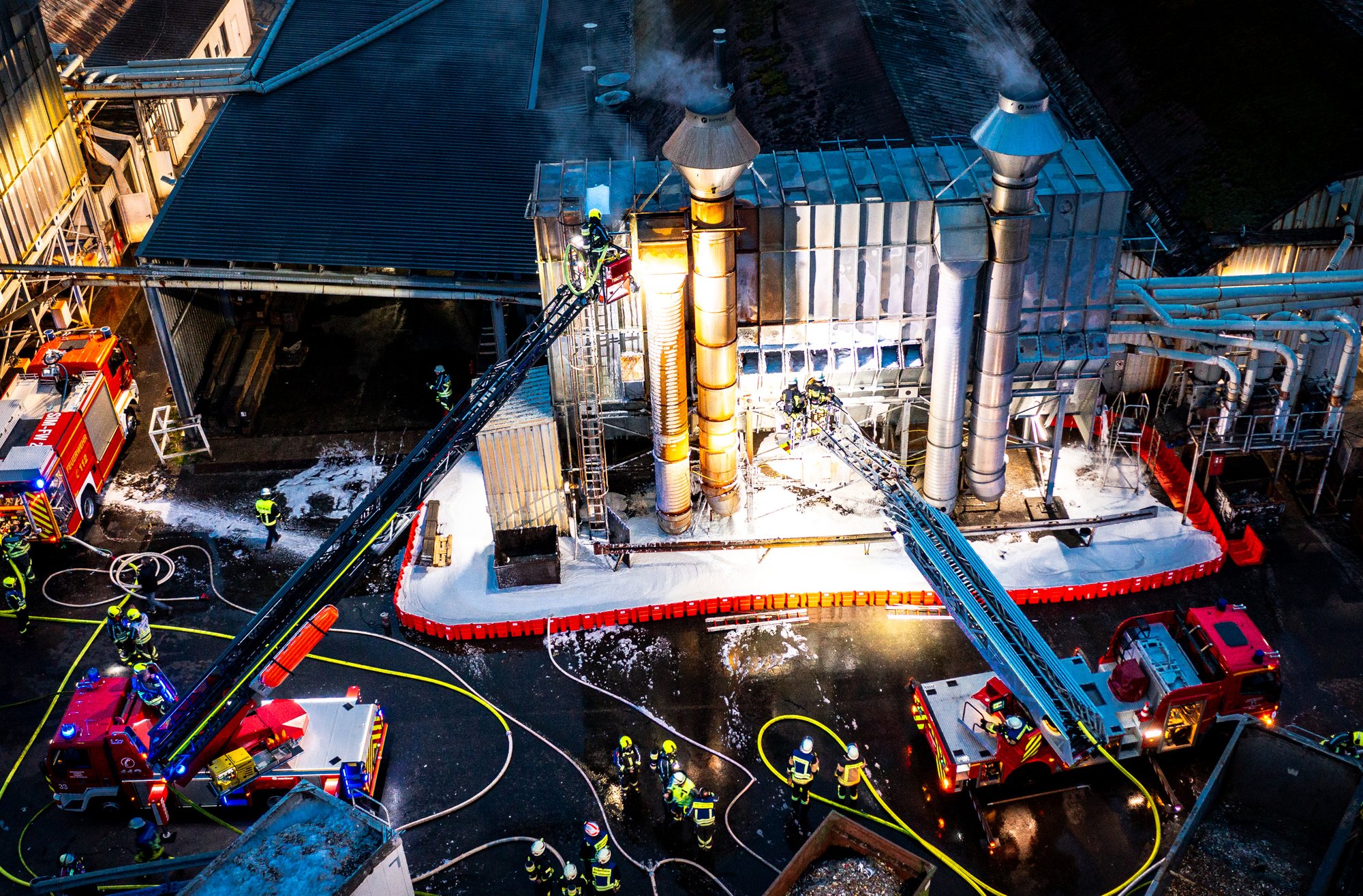 Ersten Berichten zufolge wurde der Alarm um 2:33 Uhr ausgelöst. Unter der Leitung von Wehrleiter Oliver Socha waren insgesamt 125 Einsatzkräfte vor Ort. Zur Brandbekämpfung wurden zwei Drehleitern, ein Wasserwerfer sowie mehrere Strahlrohre eingesetzt. Die Filteranlage wurde zusätzlich mit Schaum geflutet. Das Löschwasser wurde im Rückhaltebecken des Unternehmens aufgefangen.