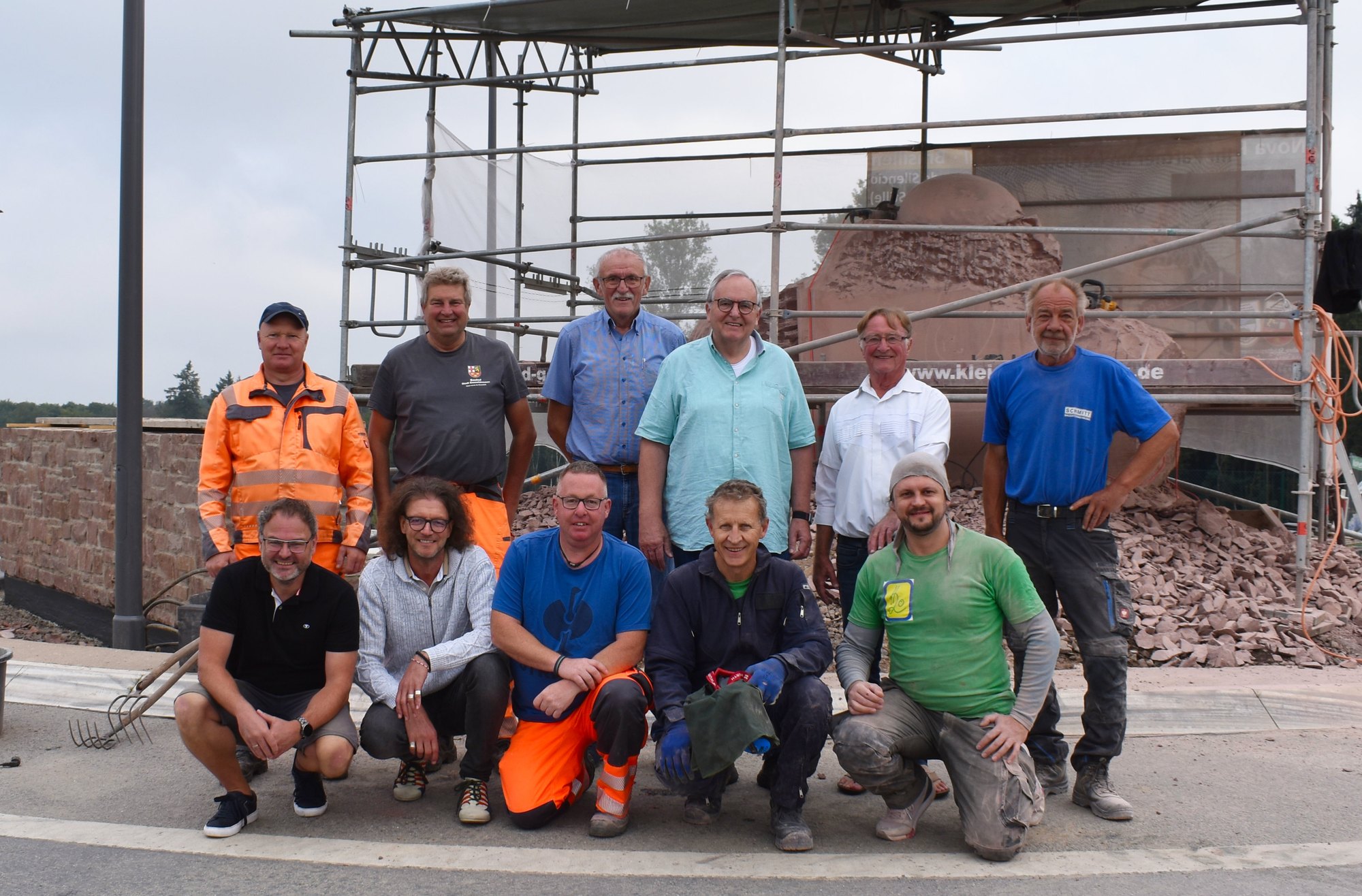 Gut 20 Tonnen wog der Sandstein-Monolith, als er Anfang August in der Mitte des Kreisverkehrs gehoben wurde. Nach ein paar Tagen war dieser schon um einiges »leichter«, wie bei unserem Baustellenbesuch am dritten Tag der Arbeiten deutlich erkennbar war.