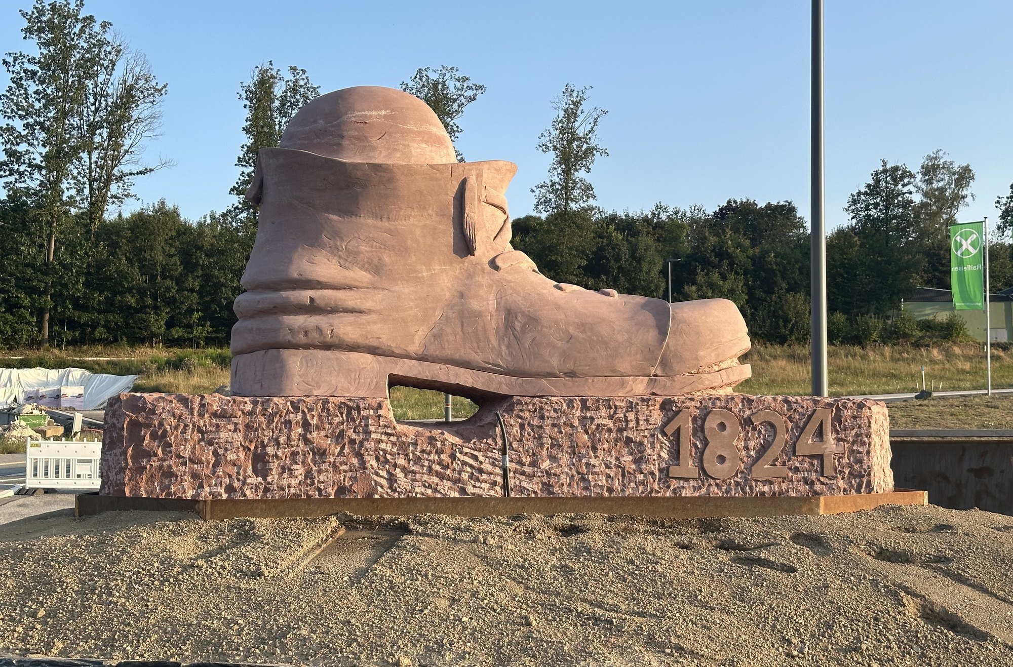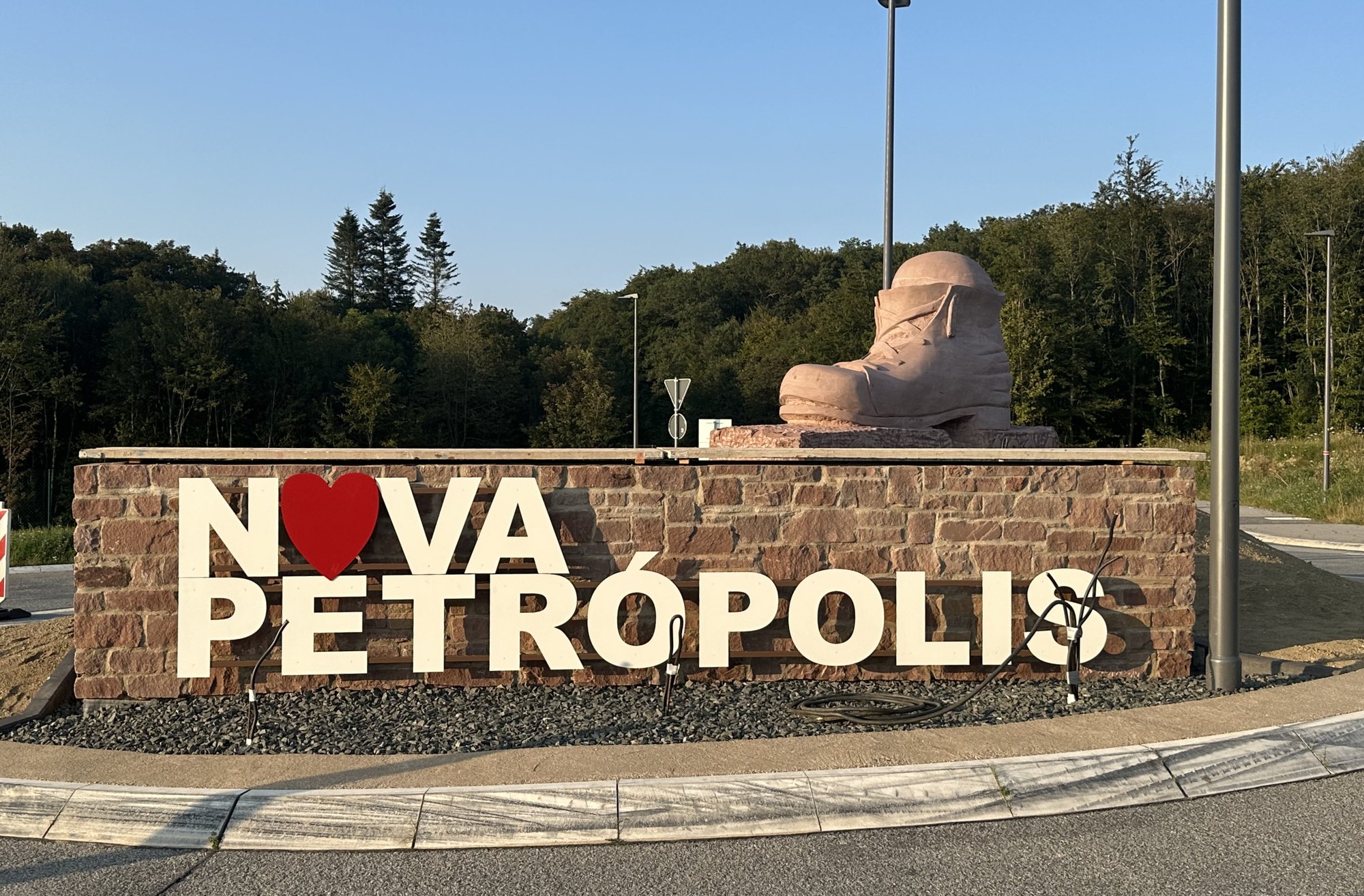 Der große Wanderschuh, der nun in der Mitte des Kreisels thront, symbolisiert die Auswanderung nach Brasilien. Zudem trägt der Kreisel an der Stadtausfahrt den Schriftzug »Nova Petrópolis« in Edelstahl auf rotem Sandstein und an der Stadteinfahrt »Emmelshausen« in Edelstahl auf Schiefer. Besonders gut ist das Timing. So wurde der neue Partnerstadtkreisel pünktlich im Jubiläumsjahr »200 Jahre Auswanderung nach Brasilien« eingeweiht – mitgestaltet von einem Nachfahren der Hunsrücker Auswanderer.