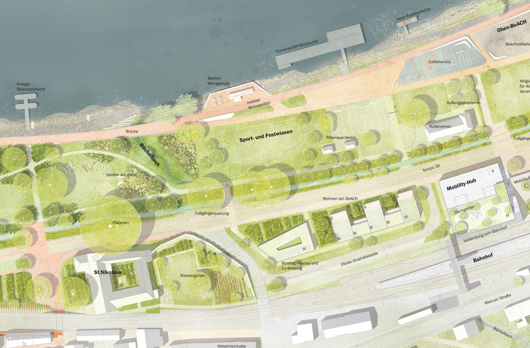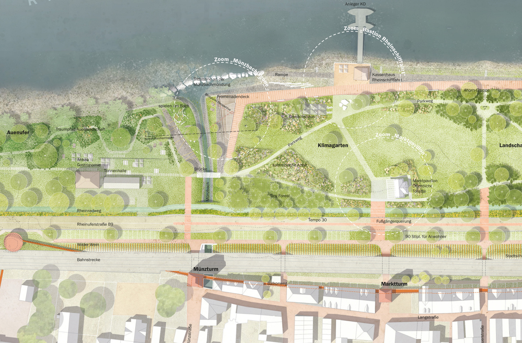 Der Ideenteil des Wettbewerbsbeitrags - der Übergang von der Altstadt zu den Rheinanlagen - berücksichtigt weitgehend die Vorgaben gemäß der Planung des Landesbetriebs Mobilität. Der Entwurf geht davon aus, dass ein Mobilitäts-Hub beim künftigen Edeka-Markt die Parkmöglichkeiten optimiert.